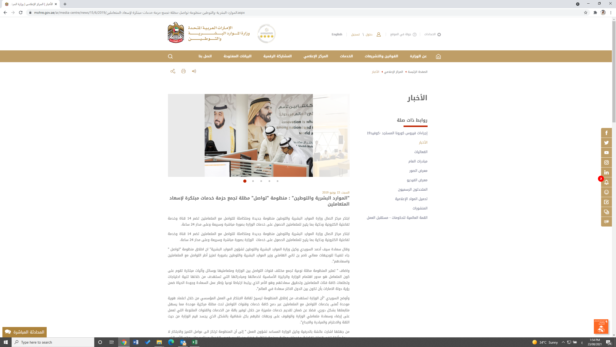 أطلقت " وزارة الموارد البشرية والتوطين منظومة " تواصل" المتكاملة للتواصل والعناية بالمتعاملين، وتضم ثمان أنظمة فرعية وخدمات للتواصل الفعال تفاعلية الكترونية وذكية وهي( مركز الاتصال الرئيسي 80060، ونظام إدارة العلاقة مع المتعاملين الحاصل على أربع شهادات معتمدة الأيزو (سلسلة 10000) منذ العام 2015، وكشف الحساب التفاعلي وقنوات التواصل الاجتماعي الأول من نوعه بالدولة وقناة البريد الالكتروني والدعم الفني للمنشآت والدردشة المباشرة ونظام تقييم مستوى جودة الخدمات المبتكر لمتعاملي مراكز الخدمة عبر الموقع الالكتروني للوزارة) بما يتيح للمتعاملين الحصول على خدمات الوزارة بصورة مباشرة وسريعة وعلى مدار 24 ساعة، ودعمتها بأنظمة CRM لصوت المتعامل يتم من خلاله تسجيل ملاحظات واقتراحات واستفسارات المتعاملين وايصالها الى أصحاب القرار في الوزارة والرد عليه خلال الوقت المحدد ، كما طورت الوزارة خدمة الخط الساخن التابع لمركز الاتصال لضمان تقديم خدمات فض المنازعات العمالية بشكل فوري عبر الهاتف وزودتها ببصمة الصوت لكل من أصحاب العمل والعمال لتسريع وتسهيل الإنجاز.