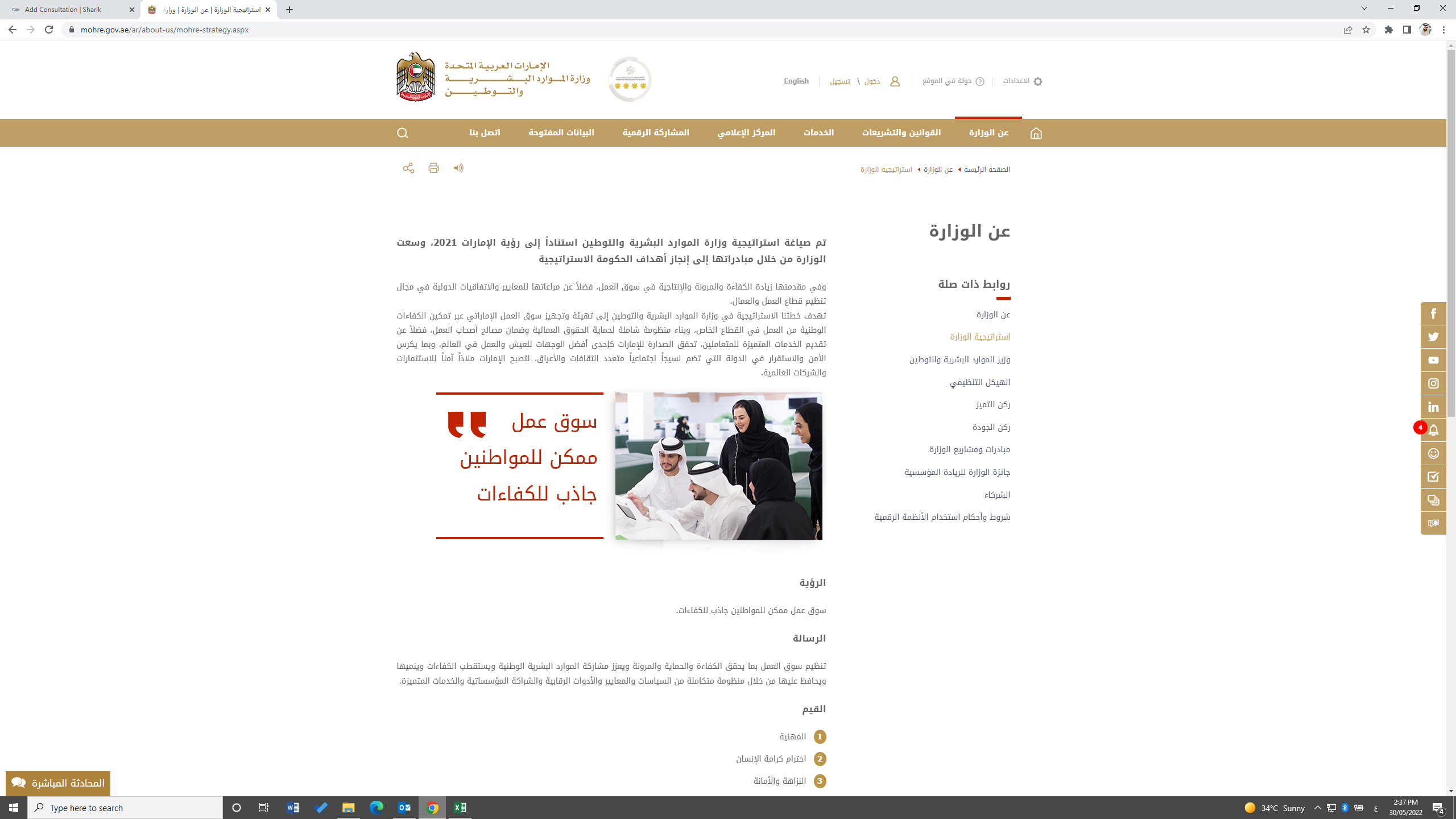 تم تطوير استراتيجية وزارة الموارد البشرية والتوطين 2017-2021 استناداً إلى رؤية الإمارات 2021، وسعت خلالها إلى إنجاز أهداف الحكومة الاستراتيجية وفي مقدمتها زيادة الكفاءة والمرونة والإنتاجية في سوق العمل، فضلاً عن مراعاتها للمعايير والاتفاقيات الدولية في مجال تنظيم قطاع العمل والعمال