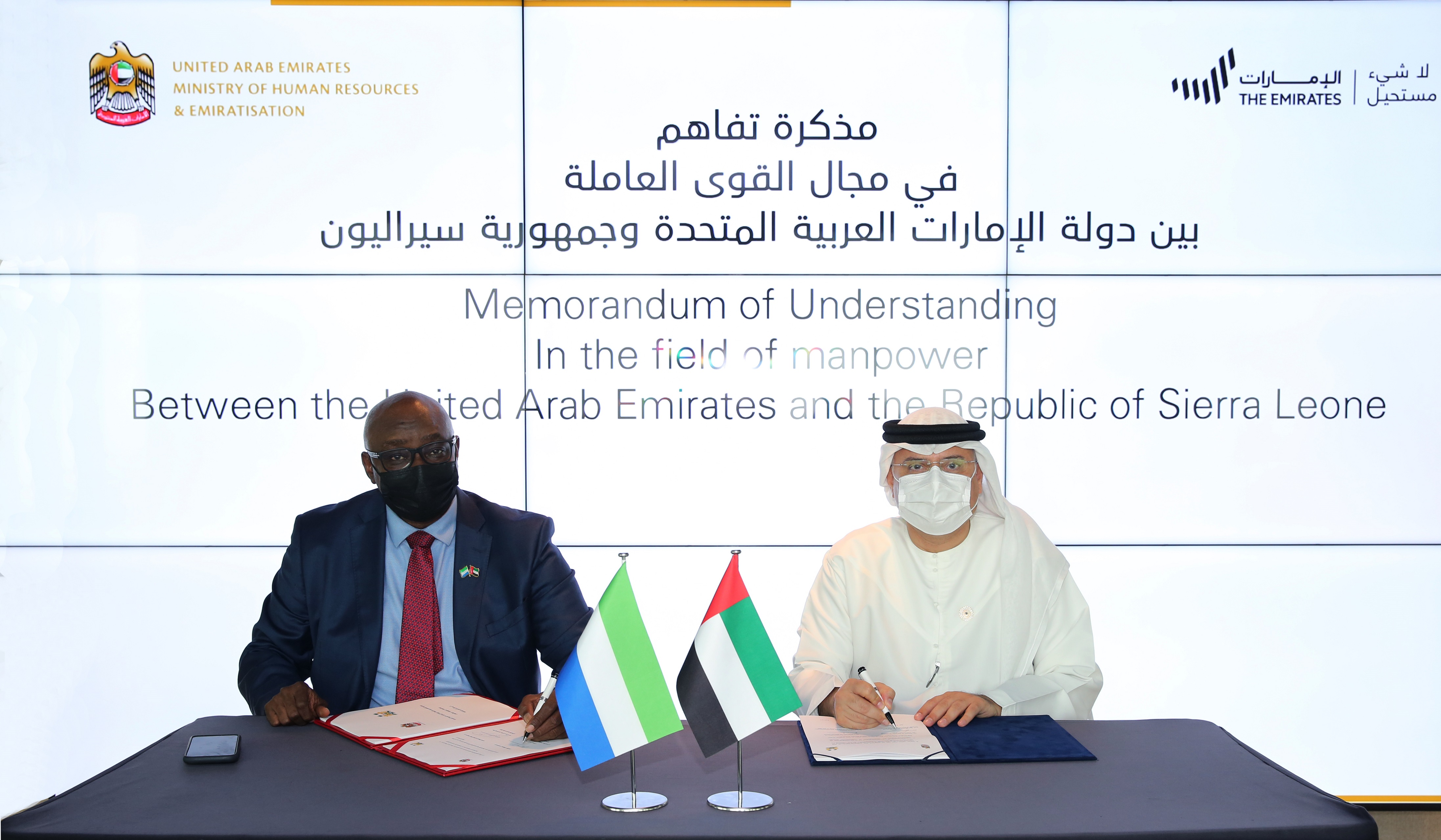 وقع المذكرة معالي الدكتور عبد الرحمن بن عبد المنان العور وزير الموارد البشرية والتوطين وسعادة رشيد سيساي السفير المفوض فوق العادة لجمهورية سيراليون في الإمارات وذلك في معرض إكسبو 2020 دبي.