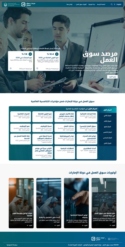 أطلقت وزارة الموارد البشرية والتوطين النسخة المحدثة من "مرصد سوق العمل في دولة الامارات"، الذي يوفر بيانات ومعلومات دورية باللغتين العربية والإنجليزية حول سوق العمل ومؤشراته ومخرجات منظومة سياسات ضبطه وتنظيمه وتنافسيته العالمية .