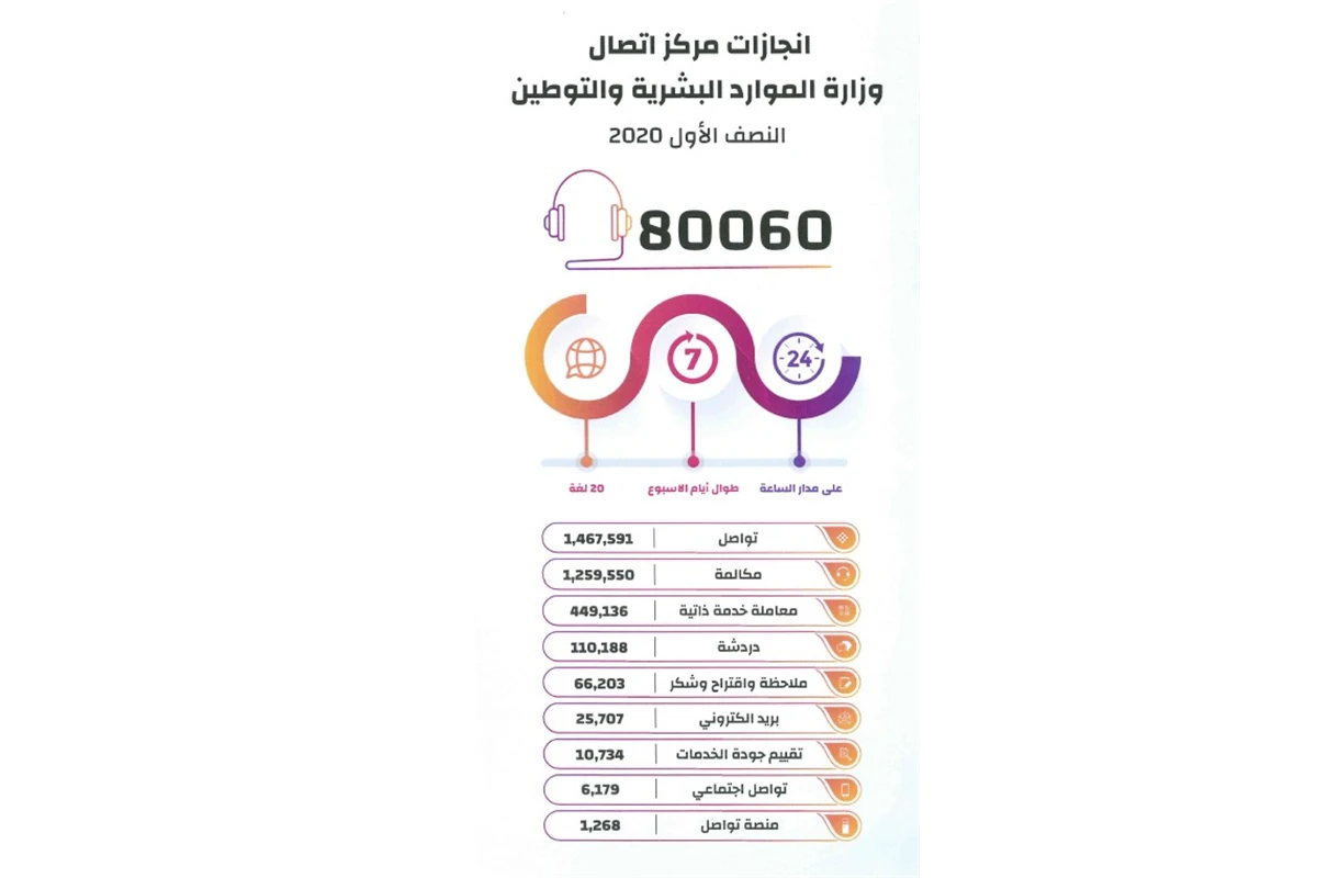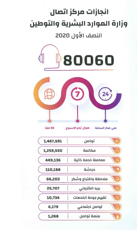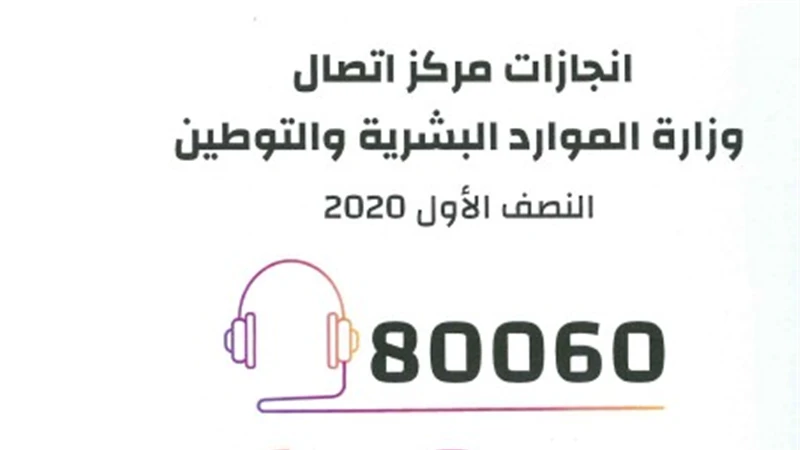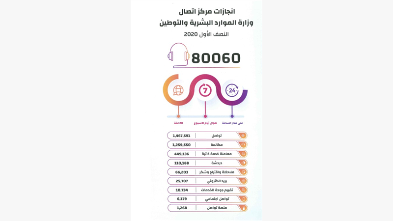 أعلنت وزارة الموارد البشرية والتوطين أن مركز الاتصال ( 80060 ) التابع لها انجز أكثر مليون و467 ألفا و591 معاملة خلال النصف الأول من العام 2020، مقارنة بمليون و230 ألفا و883 معاملة أنجزها خلال العام 2019، بزيادة قدرها 236 ألفا و708 معاملات وبما يمثل نسبة تجاوزت 16%.