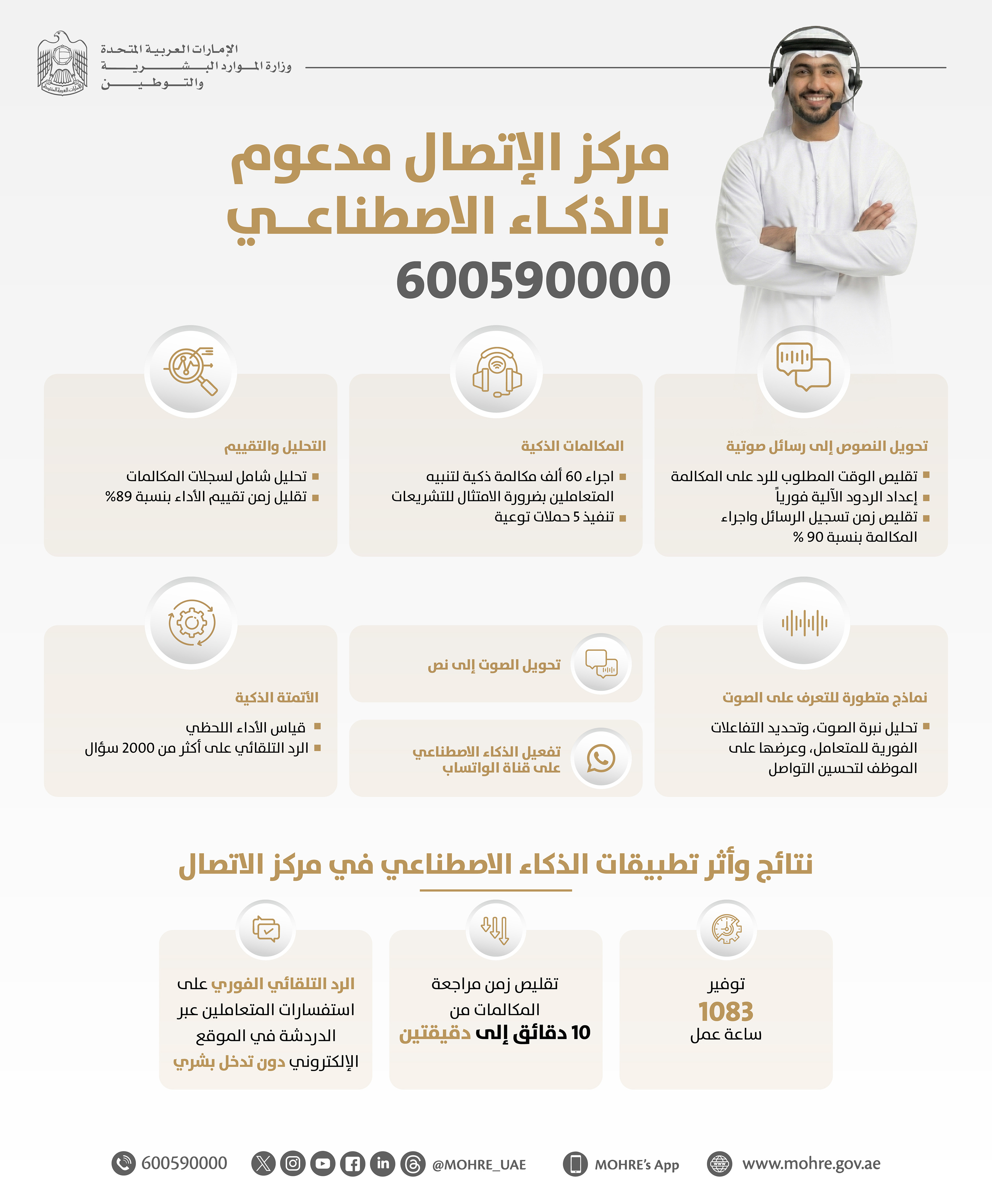 وأوضح العليلي" ان النتائج الأولية لدمج الذكاء الاصطناعي في مركز الاتصال أثبت فاعلية كبيرة في تطوير عمل المركز وهو ما يعكس جاهزية الوزارة، وكفاءة الكوادر البشرية، وقدرتها على الاستفادة من التكنولوجيا الجديدة في مختلف المجالات، وتطوير خدمات تواكب احتياجات المتعاملين، بما يعزز دورها في ريادة الخدمات الحكومية، وتصفير البيروقراطية الحكومية، وهو ما ينعكس على تحقيق الأهداف الحكومية في التحول الرقمي، ويدعم مكانة الإمارات بوصفها المكان المثالي للعيش والعمل والاستثمار .
