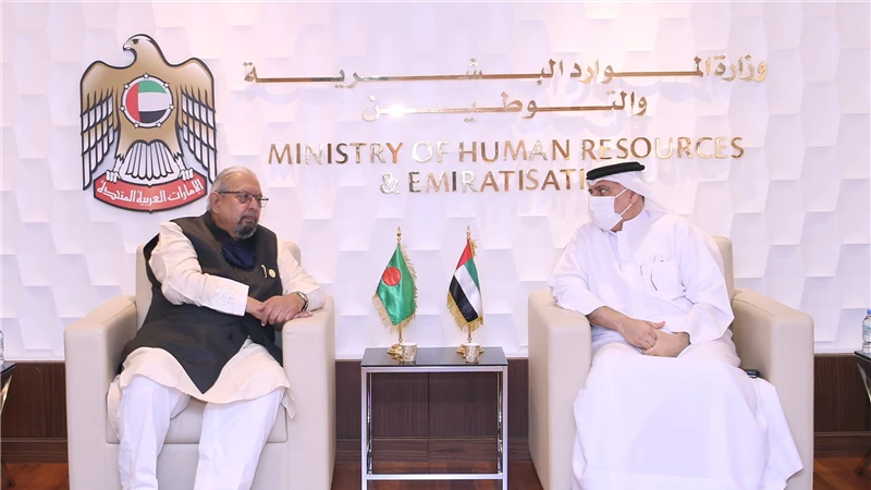 حضر اللقاء خليل خوري وكيل الوزارة لشؤون الموارد البشرية بالانابة وعبد الله النعيمي وكيل الوزارة المساعد للاتصال والعلاقات الدولية والدكتور أحمد مونيروس صالحين وكيل وزارة رعاية المغتربين والتوظيف الخارجي بجمهورية بنغلاديش ومحمد أبو جعفر سفير بنجلاديش لدى الدولة.
