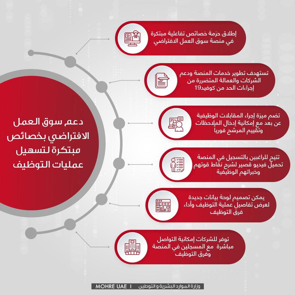 وتعتبر منصة سوق العمل الافتراضي احدى مبادرات "البرنامج الوطني لدعم استقرار سوق العمل" حيث تسهم المنصة في تعزيز مرونة الانتقال وتخفيف الأعباء التشغيلية عن المنشات التي يوجد لديها فائض في أعداد العمالة غير المواطنة وذلك من خلال تسجيل بيانات هؤلاء العمال في الموقع الإلكتروني careers.mohre.gov.ae وهو الامر الذي من شأنه دعم احتياجات سوق العمل من العمالة الداخلية في ظل وقف الاستقدام من خارج نتيجة للإجراءات الاحترازية التي تطبقها الدولة للحد والوقاية من فيروس" كورنا "المستجد.