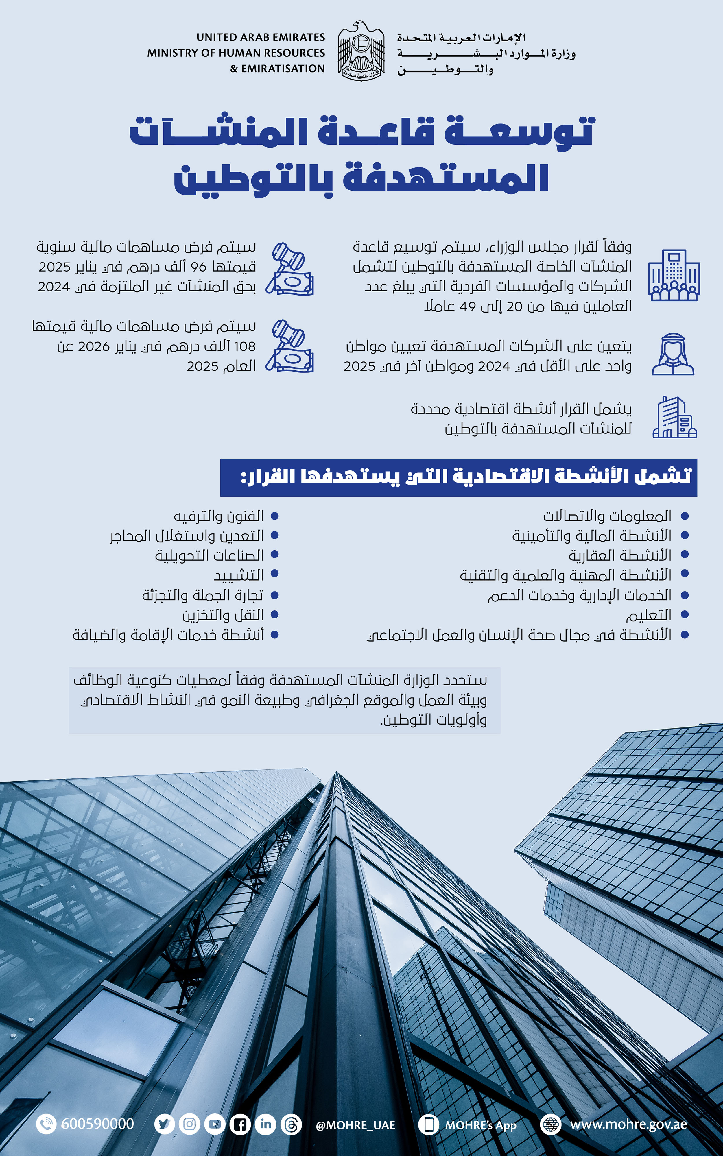تنفيذا لقرار صادر عن مجلس الوزراء في هذا الشأن، أعلنت وزارة الموارد البشرية والتوطين عن توسيع قاعدة المنشآت الخاصة المستهدفة بالتوطين لتشمل الشركات والمؤسسات الفردية التي يبلغ عدد العاملين فيها من 20 إلى 49 عاملا في نشاطات اقتصادية محددة.