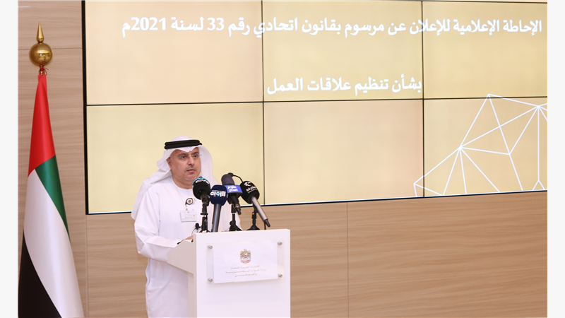 وأوضح معاليه خلال احاطة إعلامية عقدها اليوم للإعلان عن المرسوم بقانون اتحادي رقم 33 لسنة 2021 بشأن تنظيم علاقات العمل ان القانون الجديد يستهدف ضمان كفاءة سوق العمل مما يعزز جذب أفضل الكفاءات والمهارات المستقبلية من العمالة والحفاظ عليها بالتوازي مع توفير بيئة عمل محفزة وجاذبة لأصحاب العمل وهو الامر الذي من شأنه دعم الجهود المبذولة لتحقيق مستهدفات التنمية بمشاركة فاعلة من طرفي علاقة العمل.