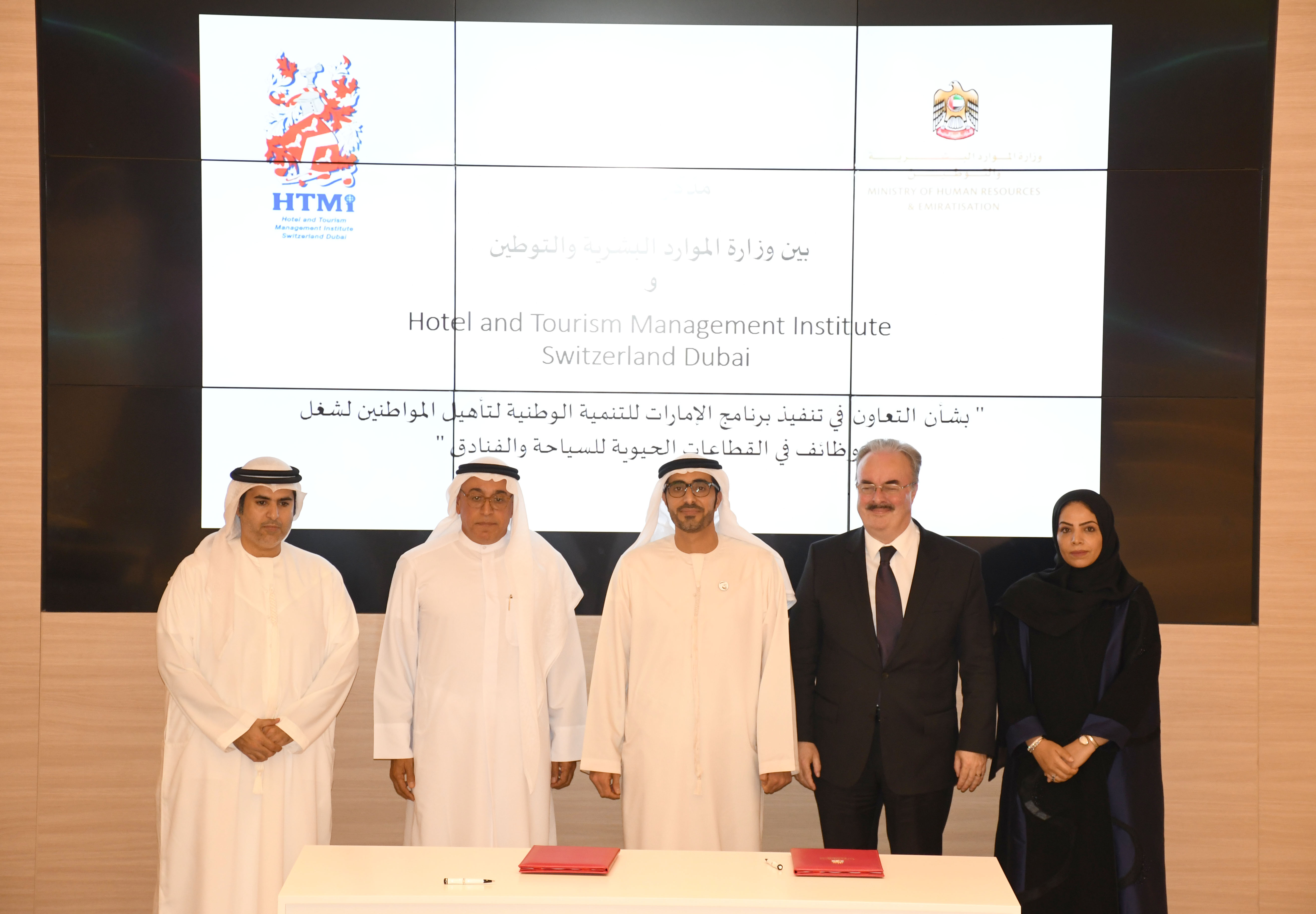أبرمت وزارة الموارد البشرية والتوطين مذكرة تفاهم مع معهد الإدارة السياحية والفندقية السويسري في دبي HTMi Switzerland وذلك في مجال تأهيل الموارد البشرية الوطنية لشغل وظائف في قطاع السياحة والضيافة والفندقة.
