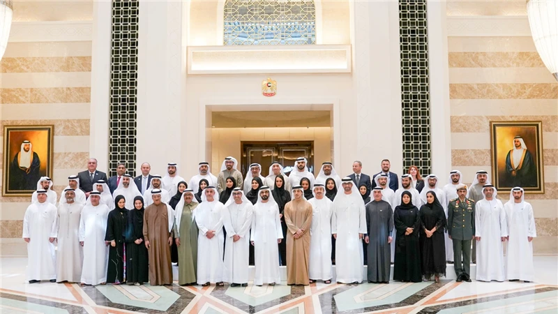 كرم صاحب السمو الشيخ محمد بن راشد آل مكتوم نائب رئيس الدولة رئيس مجلس الوزراء حاكم دبي "رعاه الله" في قصر الرئاسة بأبوظبي الفائزين بالدورة الثانية في جائزة الامارات للتوطين بحضور الفريق سمو الشيخ سيف بن زايد آل نهيان نائب رئيس مجلس الوزراء وزير الداخلية وسمو الشيخ منصور بن زايد آل نهيان نائب رئيس مجلس الوزراء وزير شؤون الرئاسة.