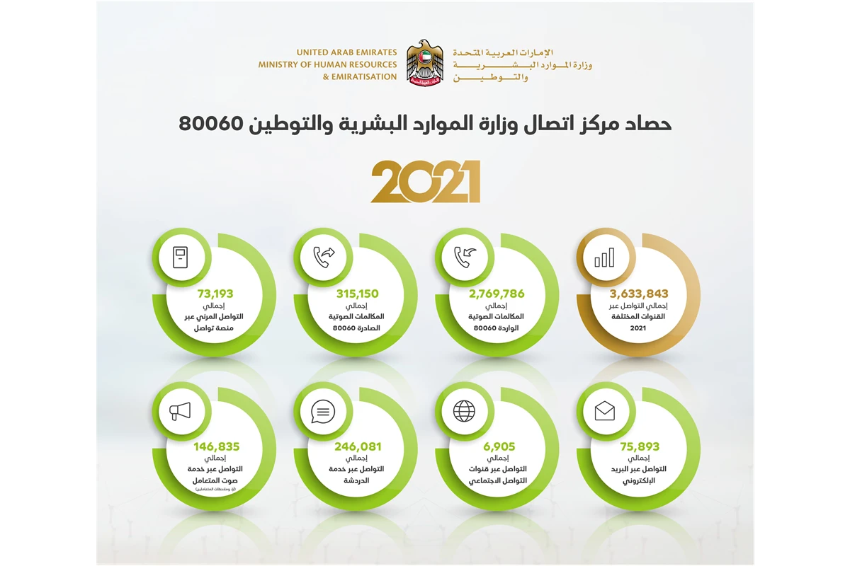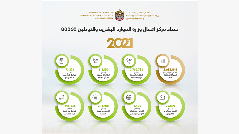 أعلنت وزارة الموارد البشرية والتوطين ان قنوات التواصل مع متعامليها شهدت خلال العام 2021 أكثر من 3 مليون و600 ألف عملية تواصل.