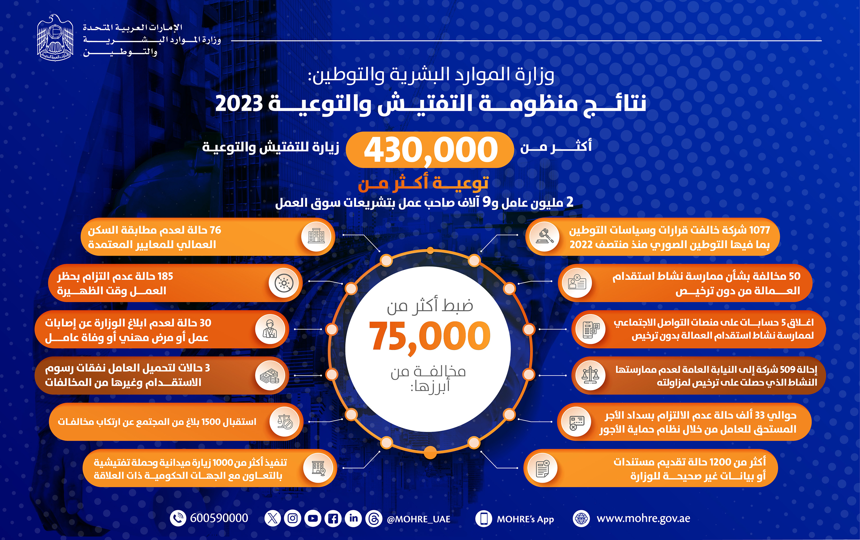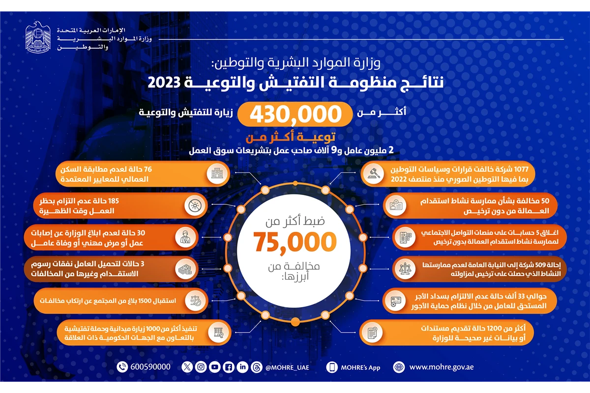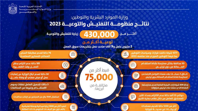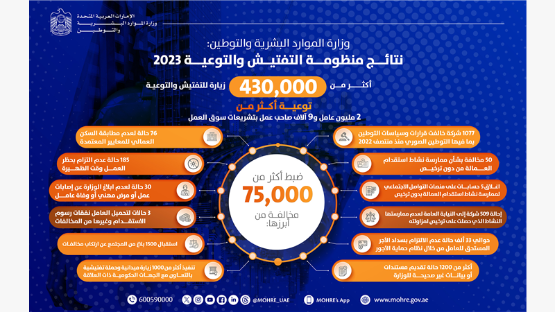حقق فريق التفتيش في وزارة الموارد البشرية والتوطين، أداءً مميزاً خلال العام 2023، عبر منظومة الرقابة والتوعية حيث تم بموجبها تنفيذ أكثر من 430 ألف زيارة تفتيشية وبرامج لتوعية القوى العاملة وأصحاب العمل بتشريعات سوق العمل، أسفر عنها ضبط أكثر من 75 ألف مخالفة وتوعية أكثر من 2 مليون عامل وما يتجاوز 9 آلاف صاحب عمل وذلك وفق البيانات التي نشرتها وزارة الموارد البشرية والتوطين على مرصد سوق العمل.
