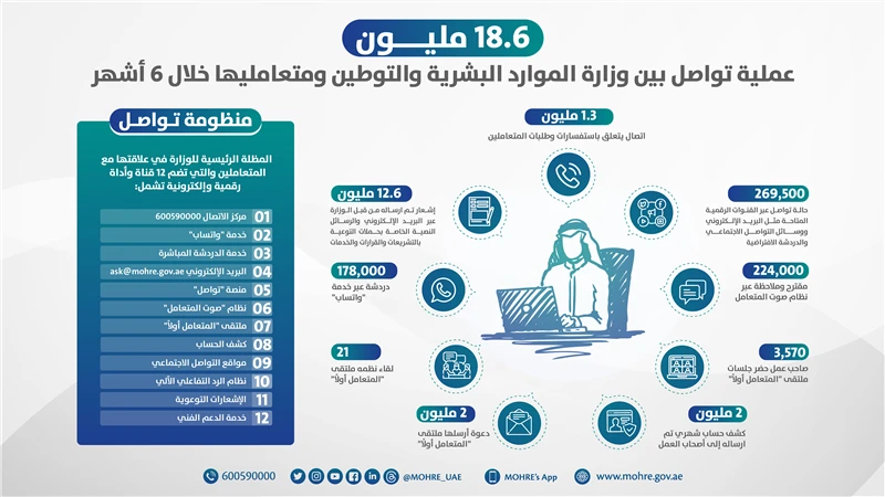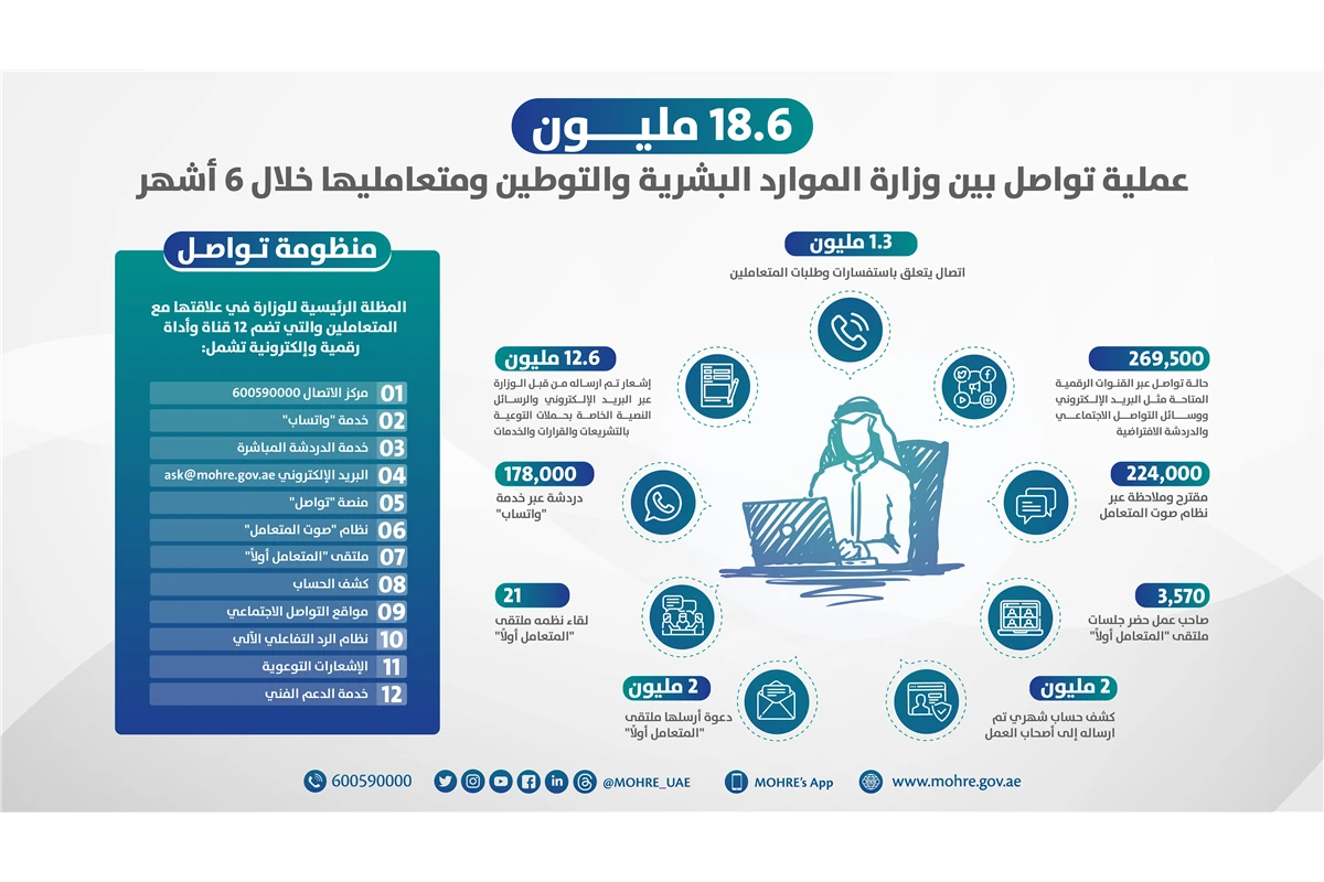أعلنت وزارة الموارد البشرية والتوطين عن اجراء نحو 18.6 مليون ألف عملية تواصل مع متعامليها خلال النصف الأول من العام الجاري وذلك من خلال منظومة "تواصل".