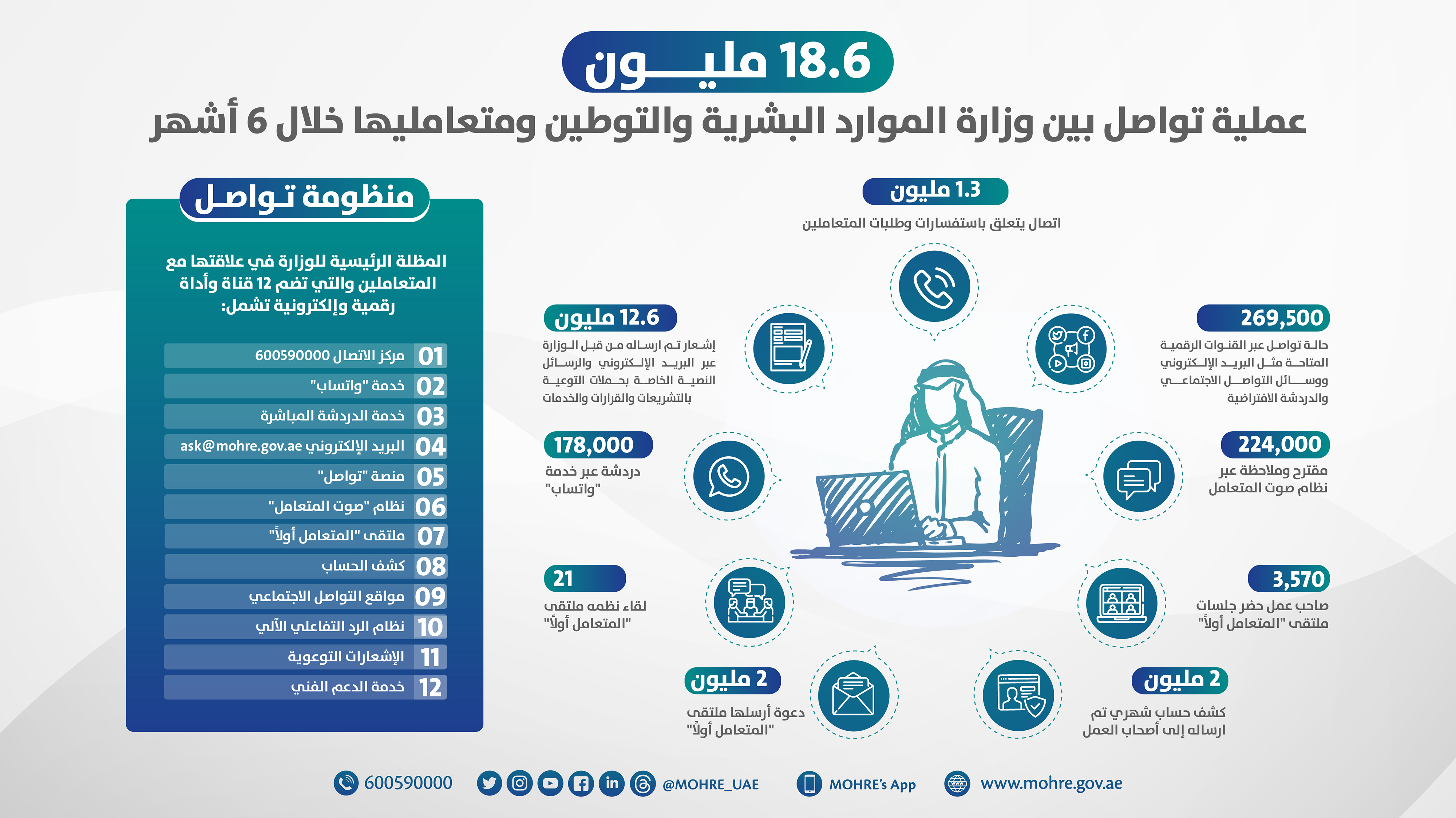 وتضم قنوات منظومة "تواصل" مركز الاتصال 600590000، وخدمة "واتساب"، وخدمة الدردشة المباشرة عبر الموقع الإلكتروني والتطبيق الذكي، والبريد الإلكترونيask@mohre.gov.ae ، إلى جانب منصة "تواصل" في مكاتب وزارة الموارد البشرية والتوطين، والتي تتيح المكالمات المرئية والصوتية مع المتعاملين ونظام "صوت المتعامل" وملتقى "المتعامل أولاً" - إضافة لحسابات الوزارة على مواقع التواصل الاجتماعي@mohre_uae ، ونظام الرد التفاعلي الآلي، والإشعارات التوعوية لأصحاب العمل والموظفين، وخدمة كشف الحساب الشهري للمنشآت.