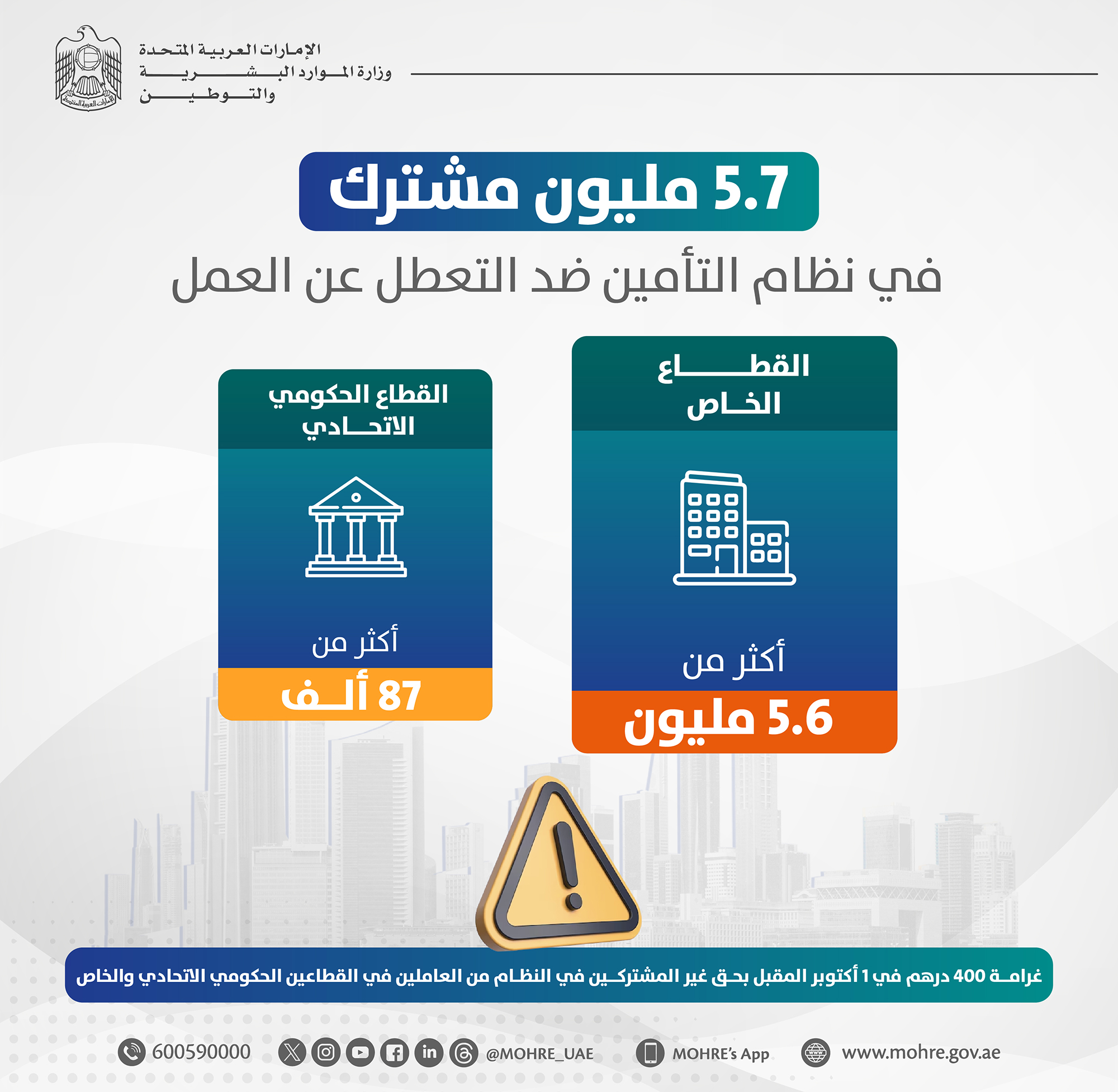 يأتي ذلك مع قرب انتهاء المهلة المحددة للاشتراك في نظام التأمين ضد التعطل عن العمل ، حيث من المقرر تطبيق غرامة مالية مقدارها 400 درهم في 1 أكتوبر المقبل بحق المشمولين بالنظام غير المشتركين فيه سواء من العاملين في القطاع الحكومي الاتحادي او القطاع الخاص من المواطنين والمقيمين، ويستثنى من التسجيل في نظام التأمين ضد التعطل كل من المستثمر (صاحب المنشأة التي يعمل بها)، والعمالة المساعدة، والعاملون بعقد مؤقت، والأحداث دون 18 عاماً، والمتقاعد الذي يتلقى معاشاً تقاعدياً والتحق بعمل جديد.