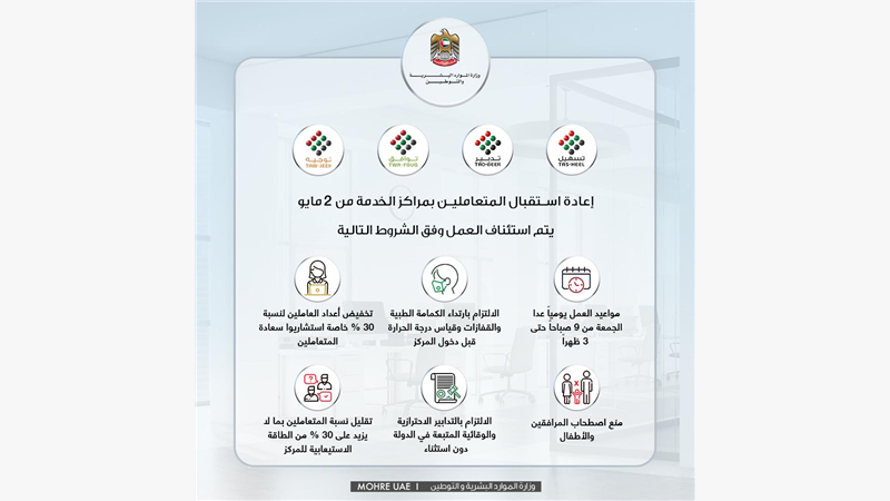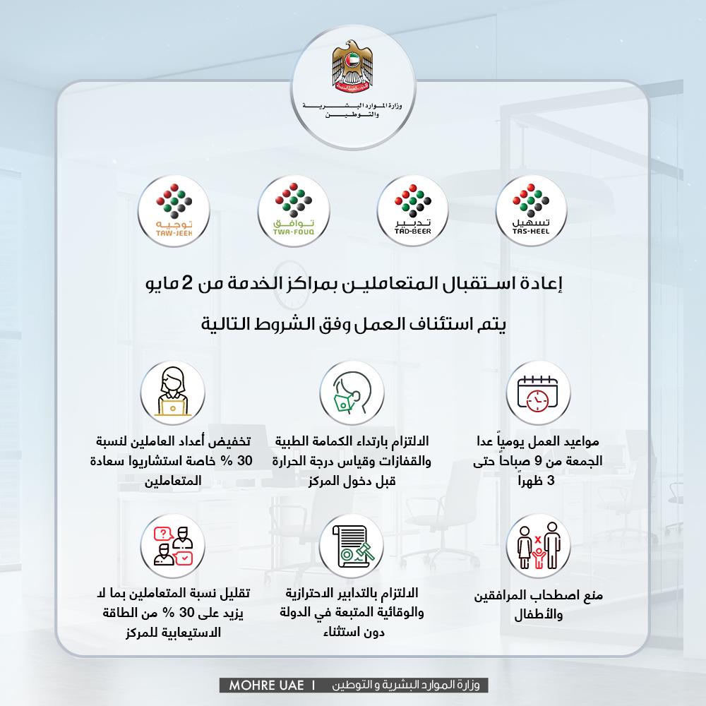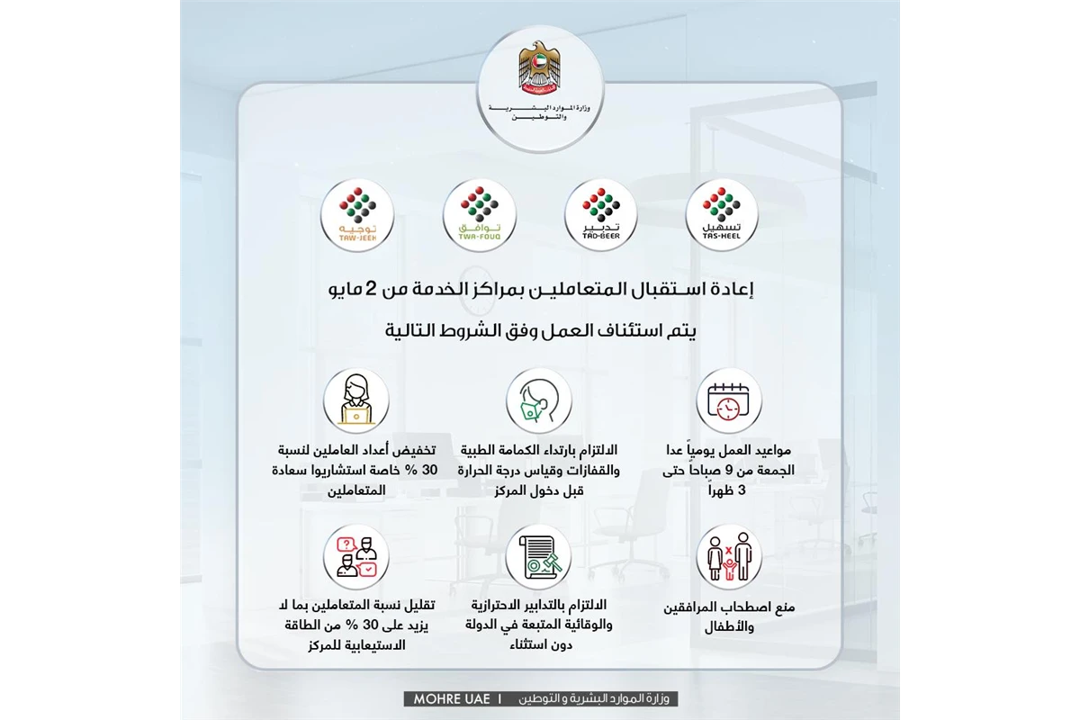 تعلن الوزارة عن السماح لمراكز الخدمة بإعادة استقبال المتعاملين اعتباراً من 2 مايو من 9 صباحاً حتى 3 من بعد الظهر ً وفق مجموعة من الضوابط والشروط للحفاظ عل صحة وسلامة الموظفين والمتعاملين