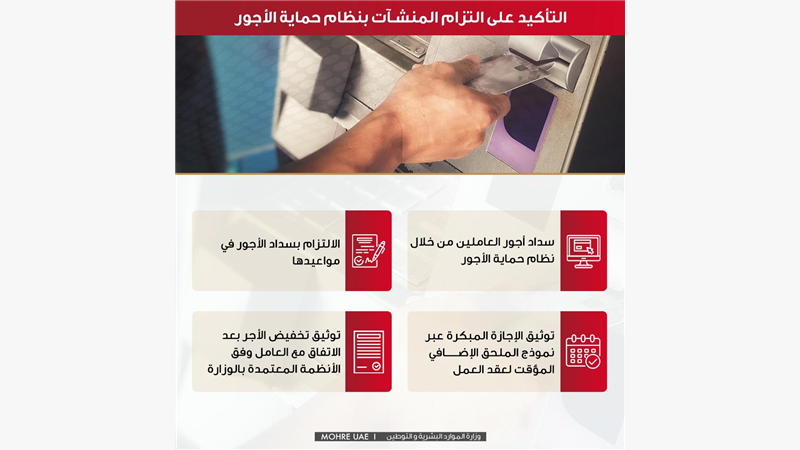اكدت وزارة الموارد البشرية والتوطين ضرورة التزام منشات القطاع الخاص بسداد أجور العاملين لديها من خلال "نظام حماية الأجور" وفقا للأجور المتفق عليها في عقود العمل المبرمة بين الطرفين وفي المواعيد المحددة.