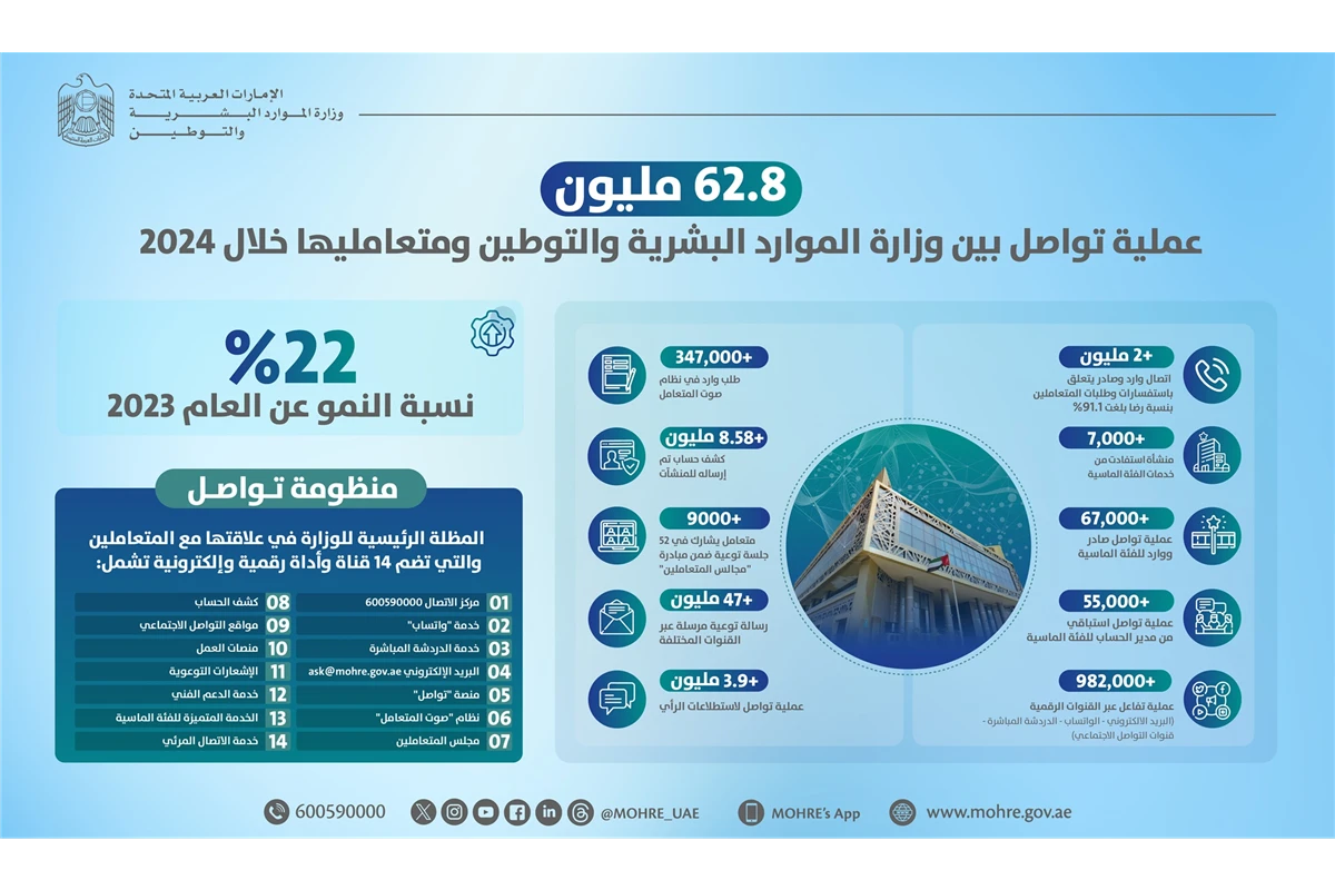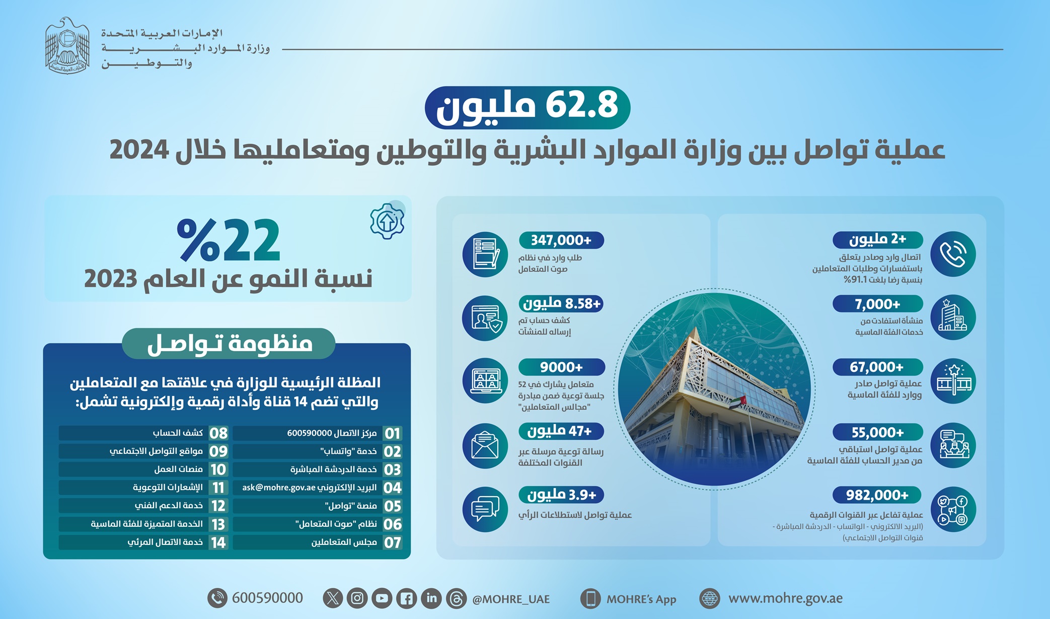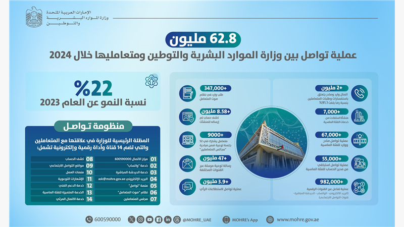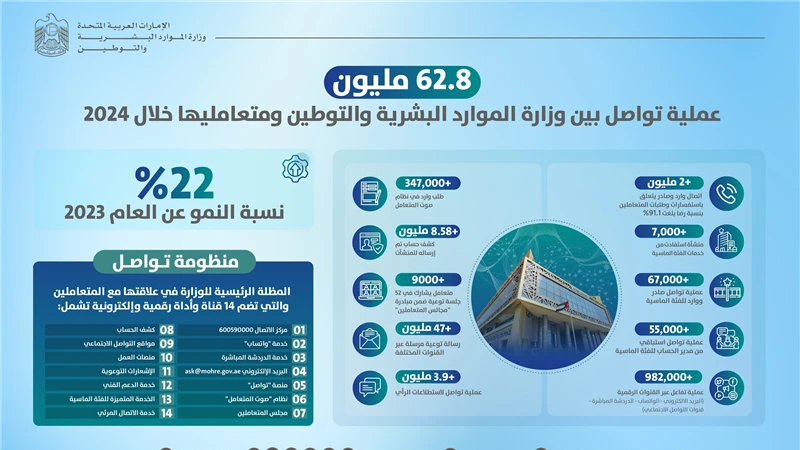 نفذت وزارة الموارد البشرية والتوطين أكثر من 62.8 مليون عملية تواصل مع متعامليها عبر منظومة "تواصل" خلال العام الماضي وذلك بنسبة نمو 22% عن العام 2023 التي بلغ إجمالي عمليات التواصل خلاله نحو 51 مليون عملية.