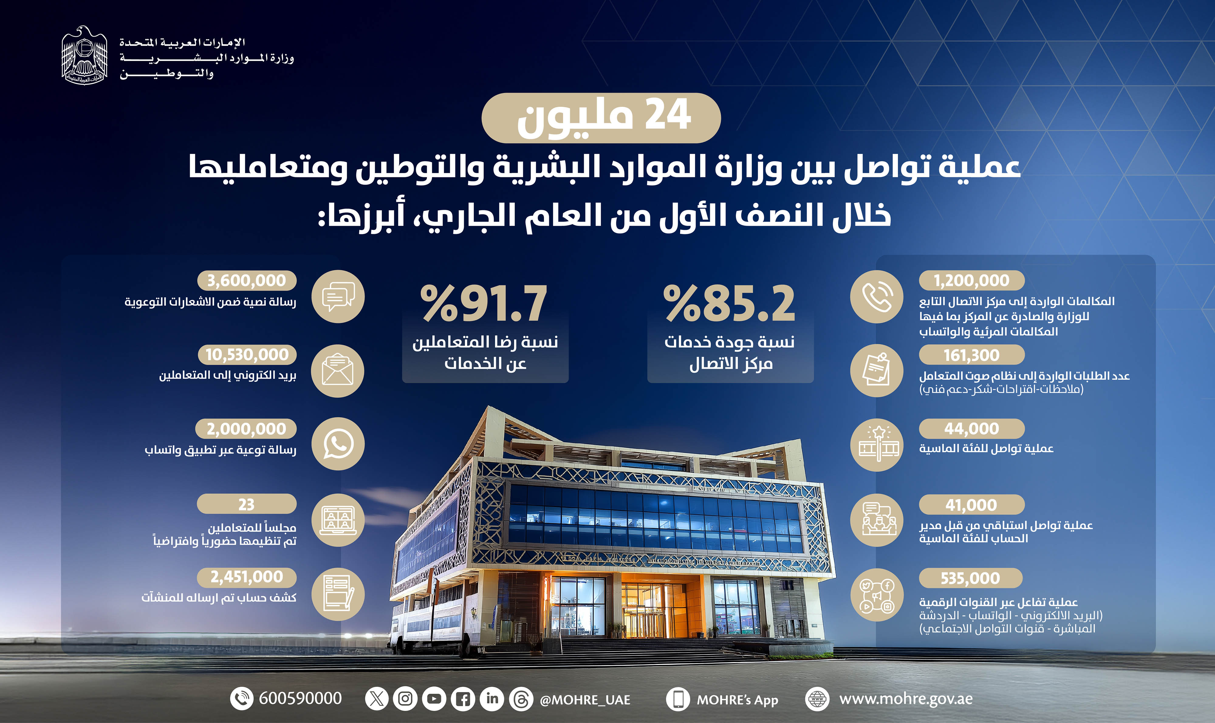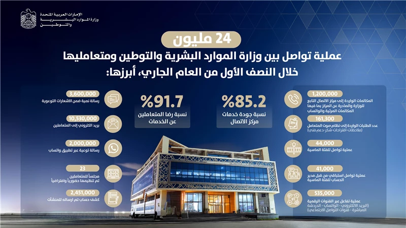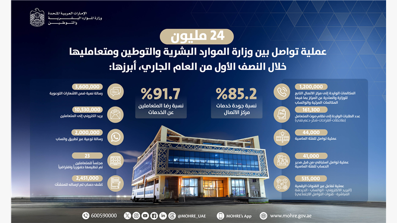 أعلنت وزارة الموارد البشرية والتوطين ان عمليات التواصل مع متعامليها بلغت خلال النصف الأول من العام الجاري أكثر من 24 مليون عملية من خلال منظومة "تواصل" ، ما يعكس مستوى جاهزية وكفاءة المنظومة، وثقة المتعاملين، وقدرتهم على التواصل من خلال الخيارات المبتكرة والسهلة والآمنة التي توفرها المنظومة، ضمن إطار من الشفافية والخصوصية.
