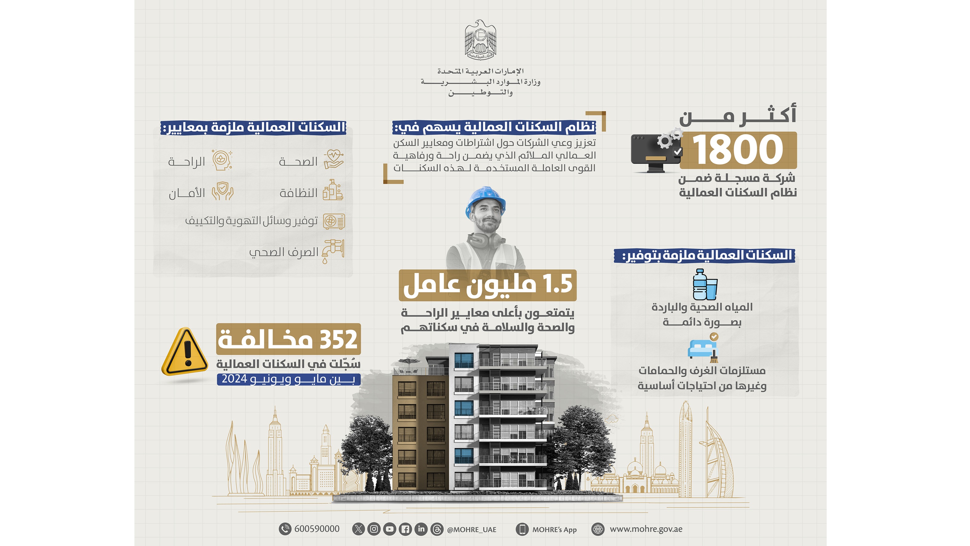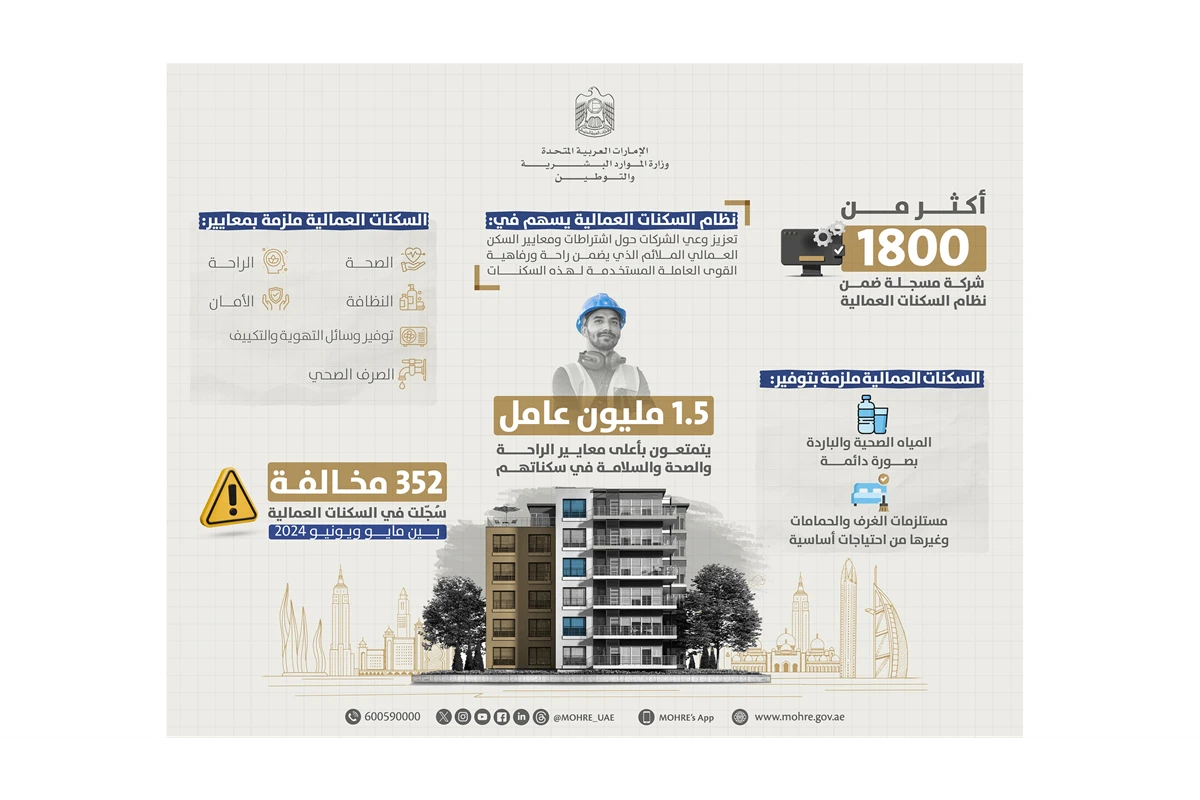وأوضحت الوزارة أن نحو 1.5 مليون عامل يستخدمون السكنات العمالية على مستوى الدولة والتي تتوفر فيها أعلى معايير الراحة والصحة بما يتوافق مع معايير السلامة وتهدف لتعزيز جودة حياة القوى العاملة في الدولة.
