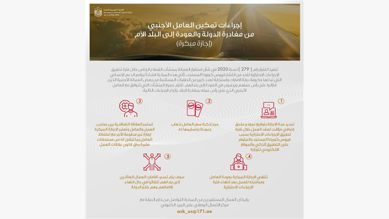 تنفيذا لقرار وزارة الموارد البشرية والتوطين رقم( 279) لسنة 2020 في شأن استقرار العمالة بمنشآت القطاع الخاص خلال فترة تطبيق الإجراءات الاحترازية للحد من انتشار فيروس كورونا المستجد، تأتي هذه المبادرة امتداداً لبرامج الدعم الإنساني التي تبذلها حكومة دولة الامارات واستجابة لعدد كبير من الطلبات المستلمة من بعض العمالة الأجنبية الذين مازالوا على رأس عملهم ويرغبون في العودة إلى بلدانهم.