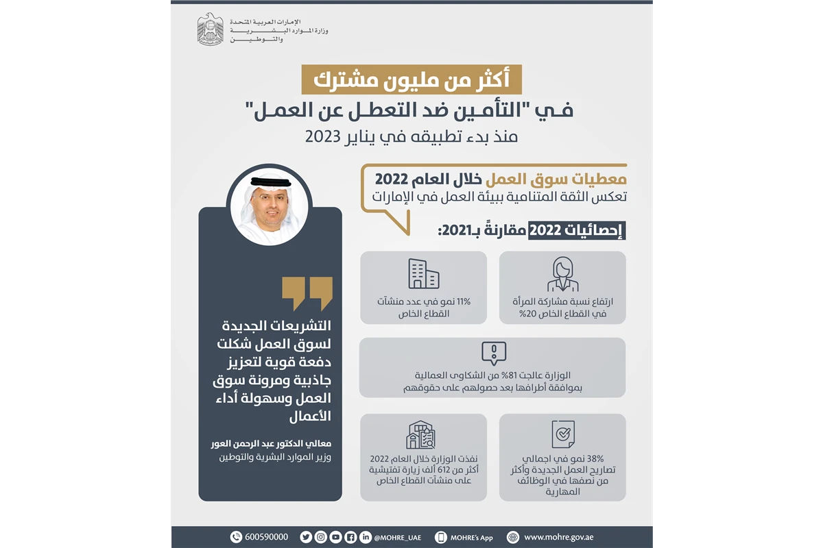 ونفذت الوزارة خلال العام 2022 أكثر من 612 ألف زيارة تفتيشية على منشآت القطاع الخاص، فيما استفاد أكثر من 2 مليون عامل في القطاع الخاص خلال الفترة ذاتها من برامج التوجيه الذاتي والتوعية والإرشاد بالحقوق والالتزامات المنصوص عليها في قانون تنظيم علاقات العمل والتي وفرتها المراكز المتخصصة بتوعية وارشاد العمال بـ 15 لغة، وذلك بالتوازي مع عقد 82 ورشة للتوعية بالقانون بمشاركة وحضور أكثر من 7 آلاف صاحب عمل.