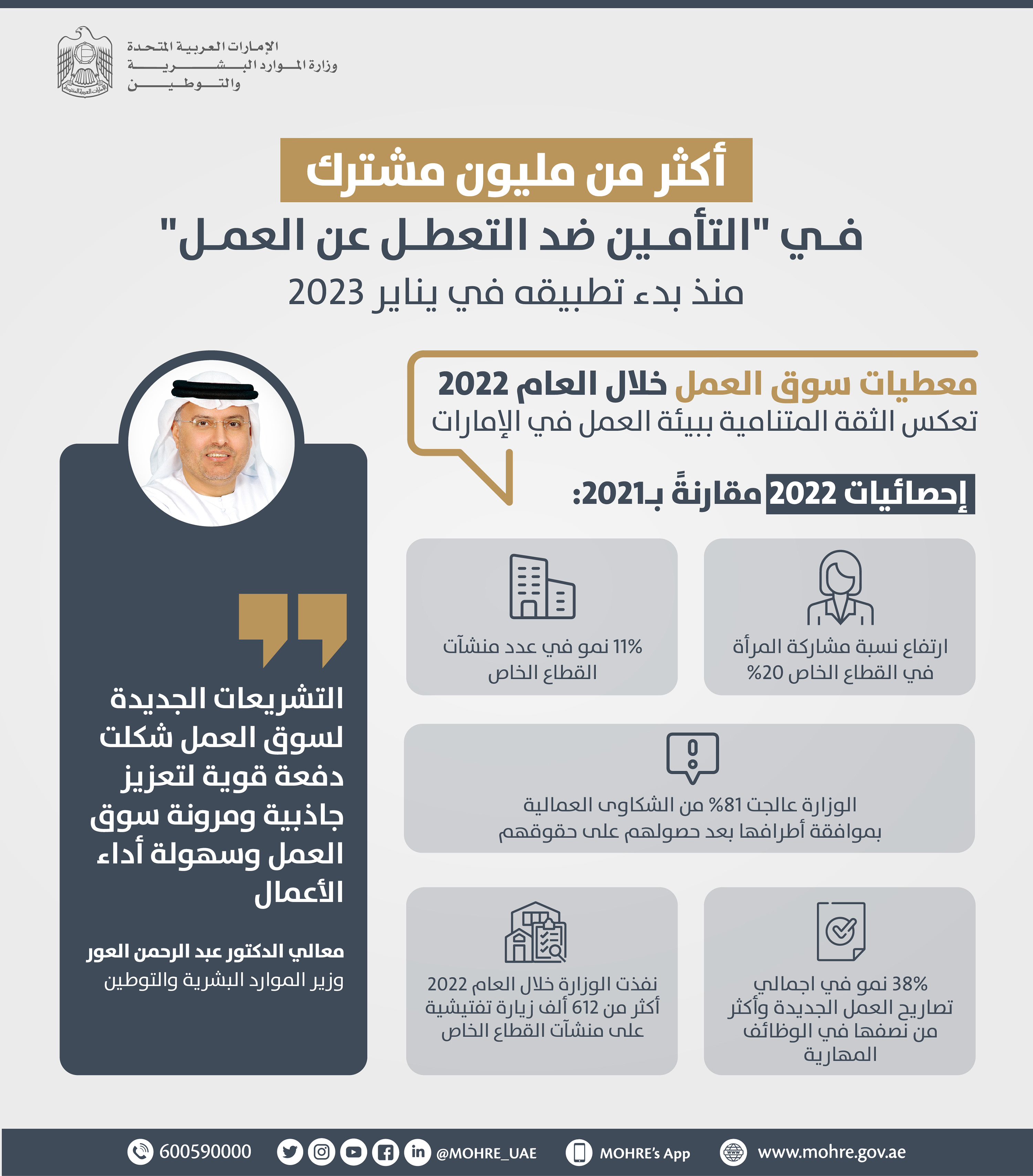 وأعلن معاليه عن نمو نسبته 11% في إجمالي منشآت القطاع الخاص في الدولة خلال العام 2022 مقارنة بـالعام 2021، مشيرا إلى أن هذا الارتفاع رافقه نمو بنسبة 38% في إجمالي عدد تصاريح العمل الجديدة الصادرة عن الوزارة، فيما ارتفعت نسبة مشاركة المرأة في القطاع الخاص بواقع 20%.