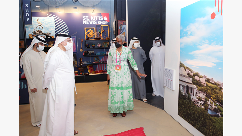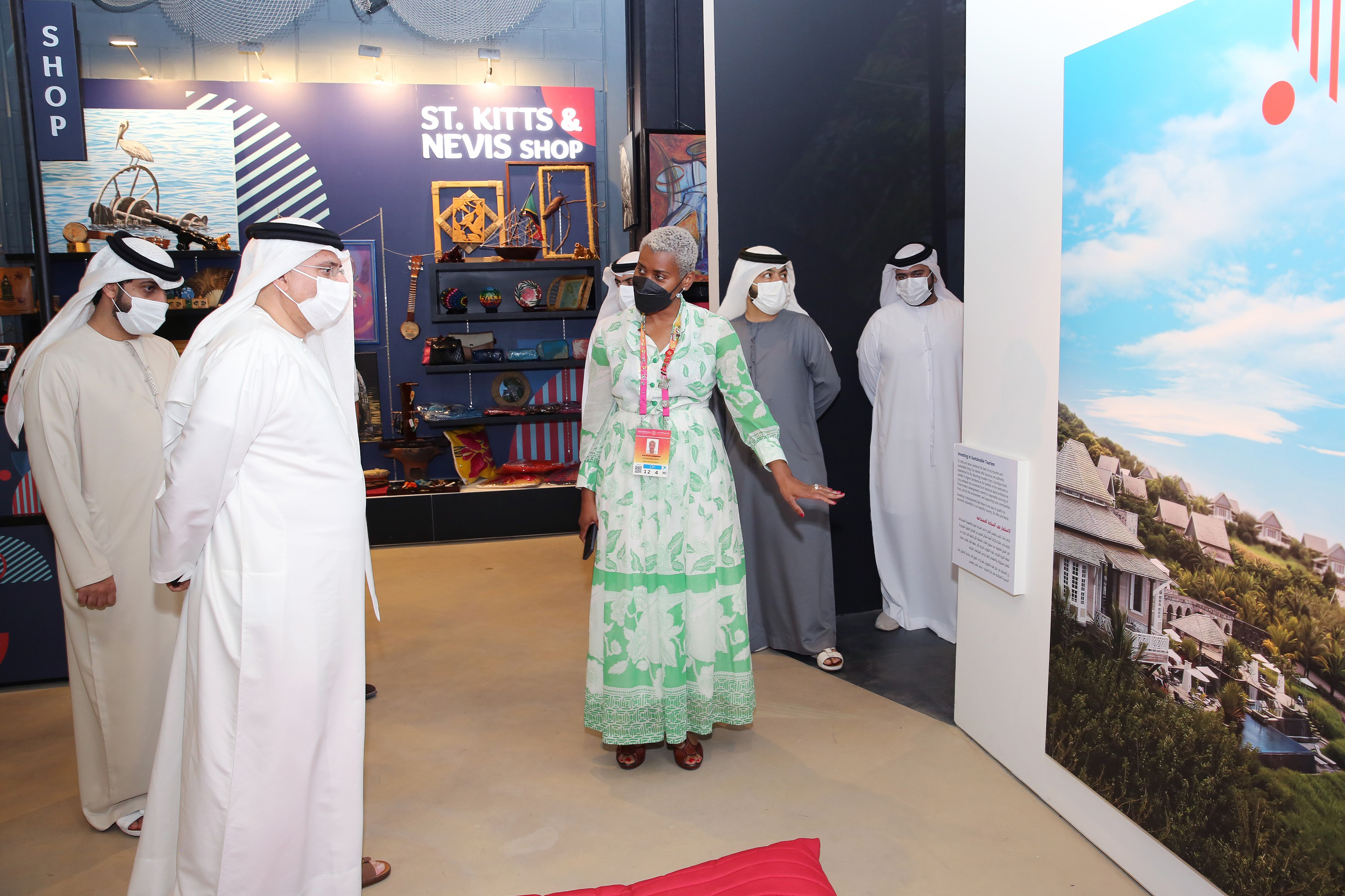 زار معالي الدكتور عبد الرحمن العور وزير الموارد البشرية والتوطين جناح اتحاد جزيرتي سانت كيتس ونيفيس بمعرض اكسبو 2020 في دبي ترافقه إلسا ويلكين أرمبريستر المفوض العام للجناح ووزير مستشار في مفوضية سانت كيتس ونيفيس العليا بلندن.