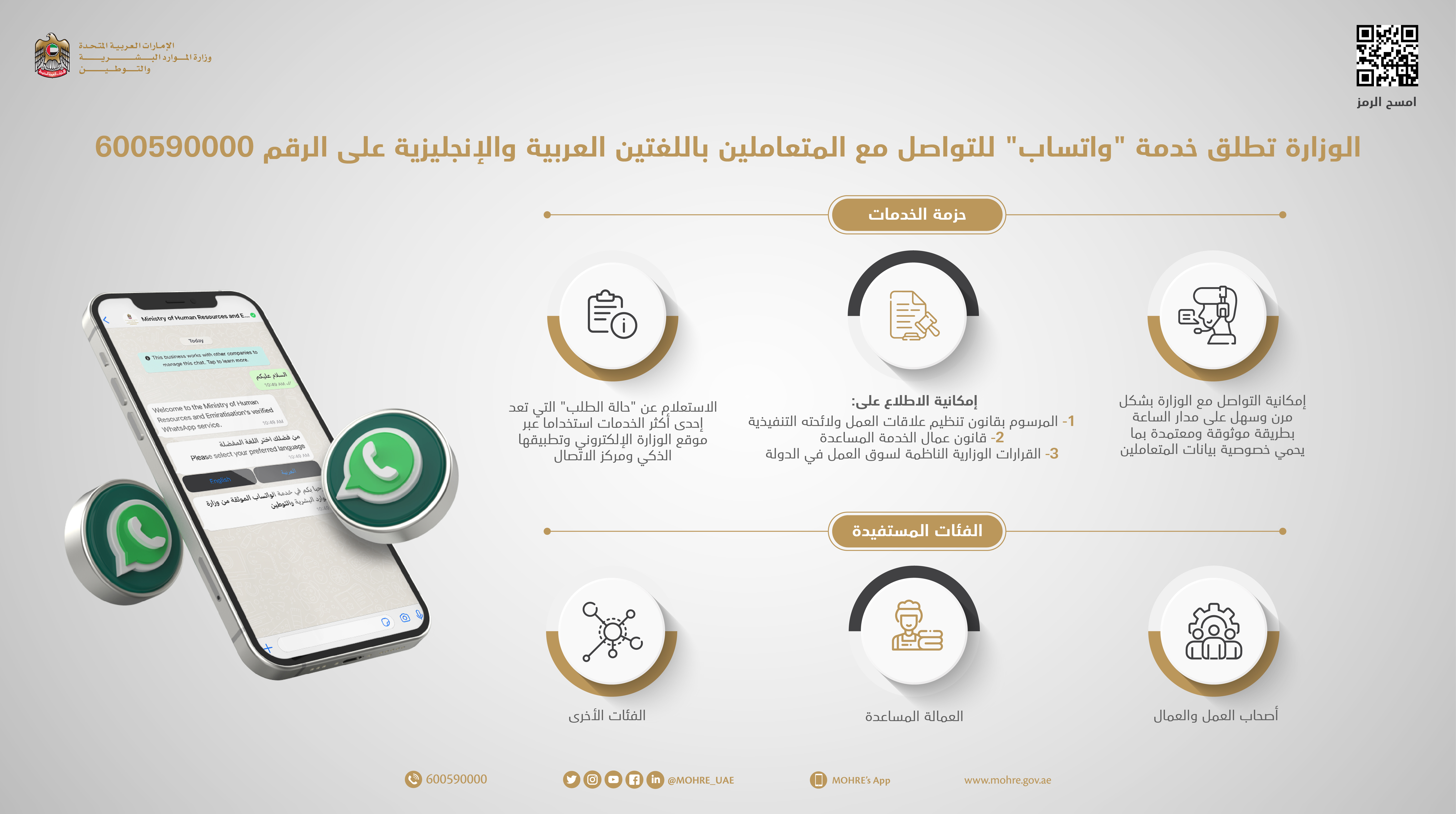 أطلقت وزارة الموارد البشرية والتوطين قناة تواصل جديدة مع متعامليها عبر تطبيق "واتساب" باللغتين العربية والإنجليزية وذلك على الرقم 600590000، لتصبح أول جهة اتحادية تملك حساباً موثقاً للأعمال على التطبيق الشهير المملوك لشركة "ميتا".