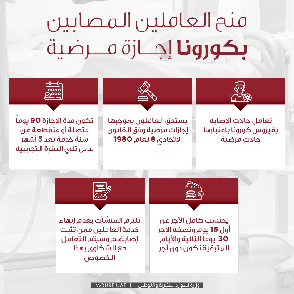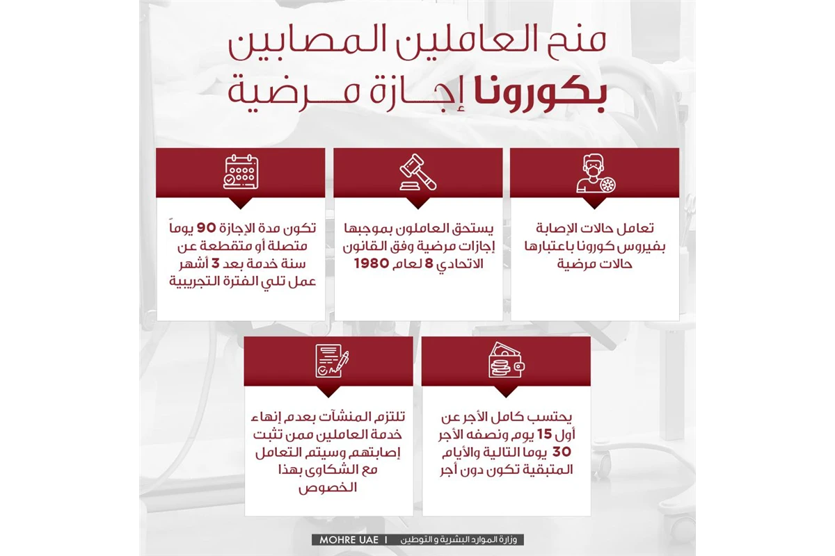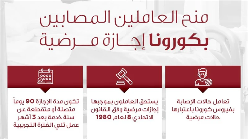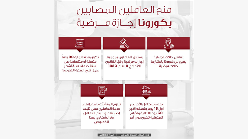 دعت وزارة الموارد البشرية والتوطين منشآت القطاع الخاص الى التعامل مع حالات العاملين الذين يتعرضون للإصابة بفيروس كورونا المستجد باعتبارها حالات مرضية يستحق بموجبها العاملين إجازات مرضية وفقا لما ينص عليه القانون الاتحادي رقم "8" لسنة 1980.
