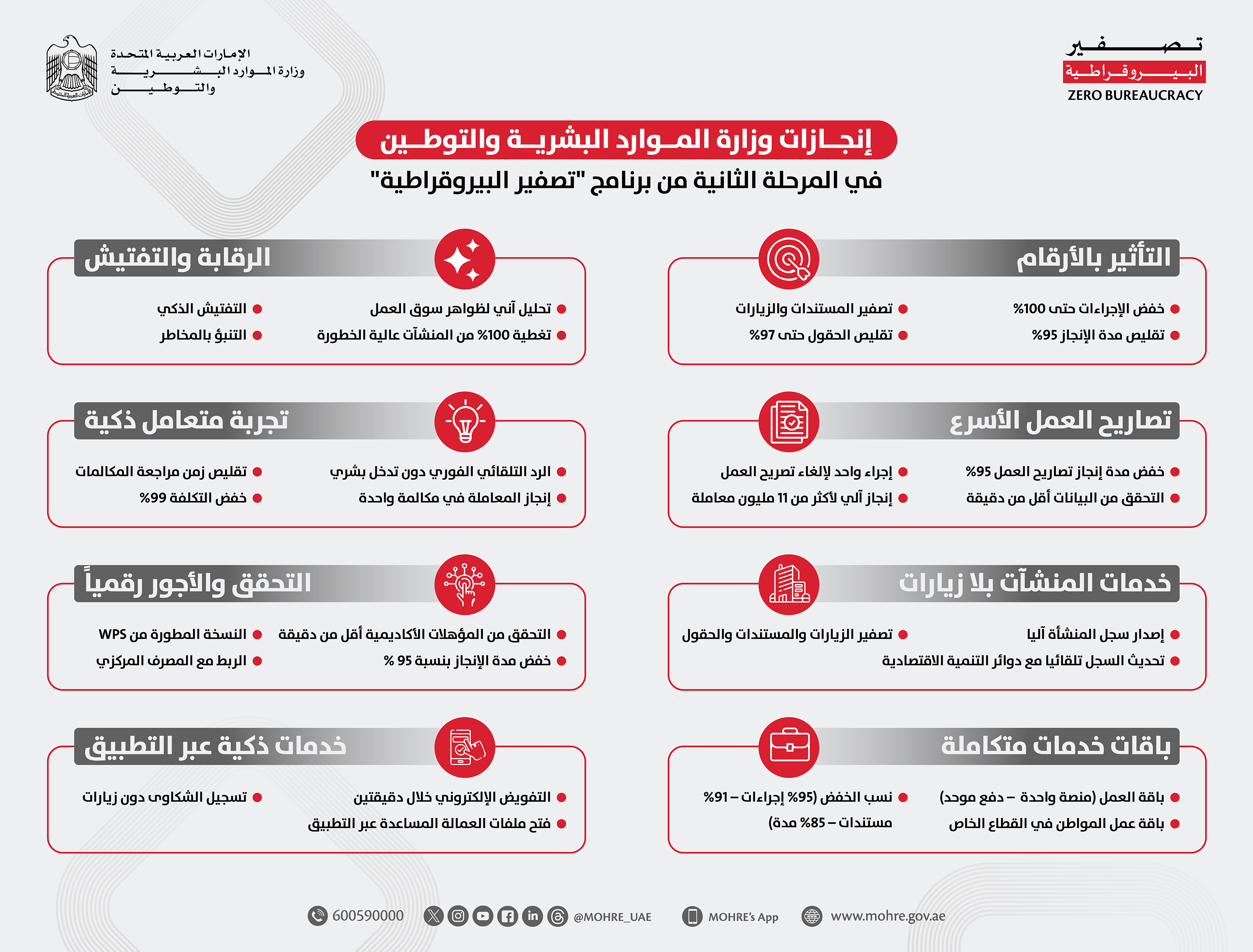 وأوضح سعادة راشد السعدي وكيل الوزارة المساعد لخدمات سوق العمل بالإنابة، ان فرق الوزارة حققت قفزات نوعية في برنامج تصفير البيروقراطية خلال مدة قياسية نتج عنها مزيداً من الشمولية والابتكار في طريقة ومستوى تقديم الخدمة للمتعاملين لتعزيز تجربتهم ودعم ريادة الخدمات الحكومية في الدولة، وترسخ مكانتها كأفضل مكان للعيش والاستثمار والعمل في العالم.