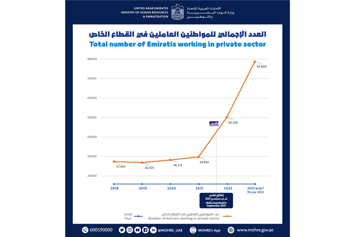 أعلنت وزارة الموارد البشرية والتوطين، اليوم، أن عدد المواطنين العاملين في القطاع الخاص بنهاية مهلة مستهدفات التوطين نصف السنوية لشركات القطاع الخاص التي يعمل لديها 50 موظفاً فأكثر بلغ نحو 79 ألفاً، وذلك بزيادة نسبتها 57% مقارنةً بالأعداد التي تم الإعلان عنها بنهاية 2022 والتي بلغت 50,228 مواطناً.