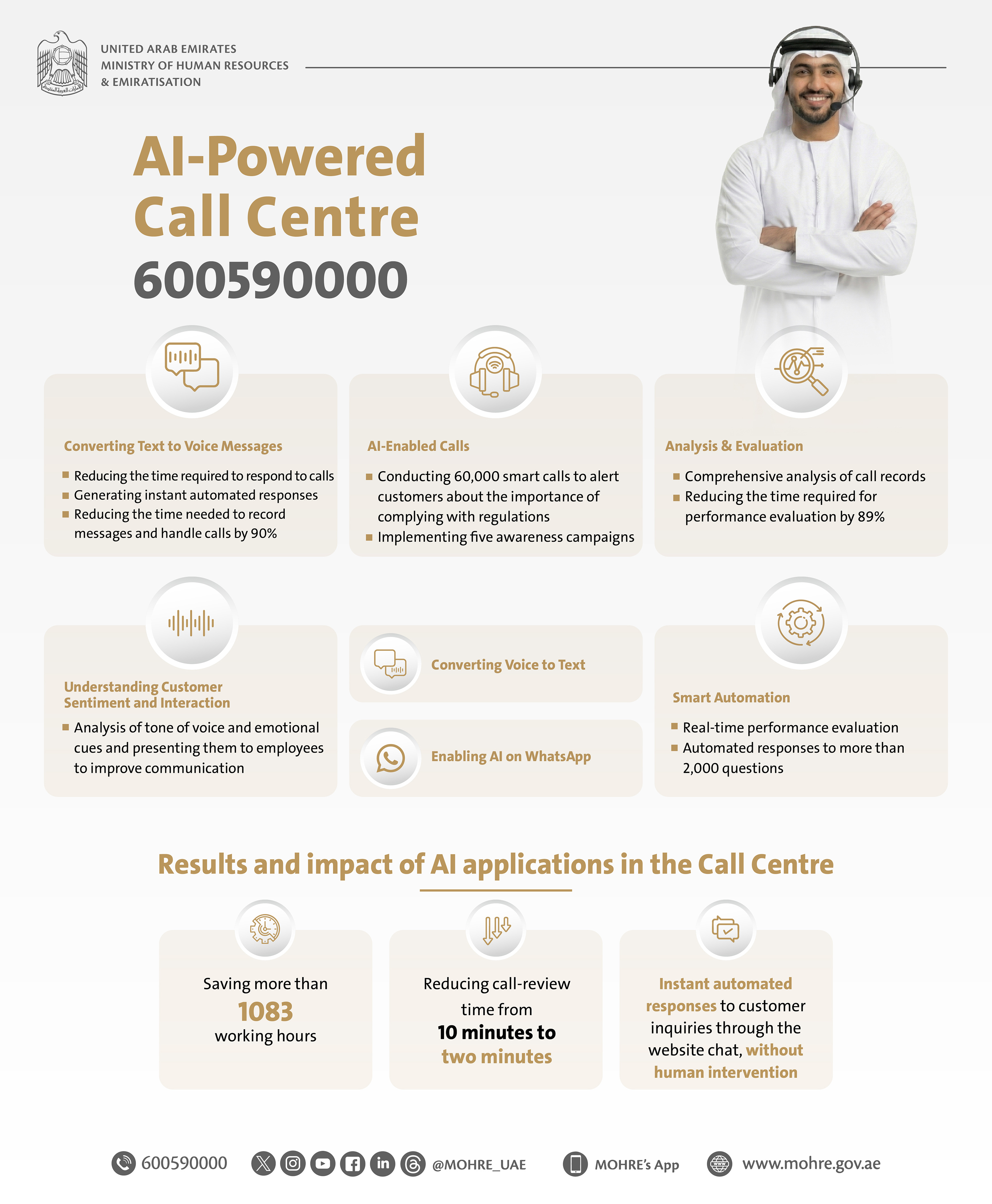 The Ministry of Human Resources and Emiratisation (MoHRE) has announced the successful integration of Artificial Intelligence (AI) applications into its Call Centre, as part of its efforts to leverage advanced technologies to enhance service quality and operational efficiency.