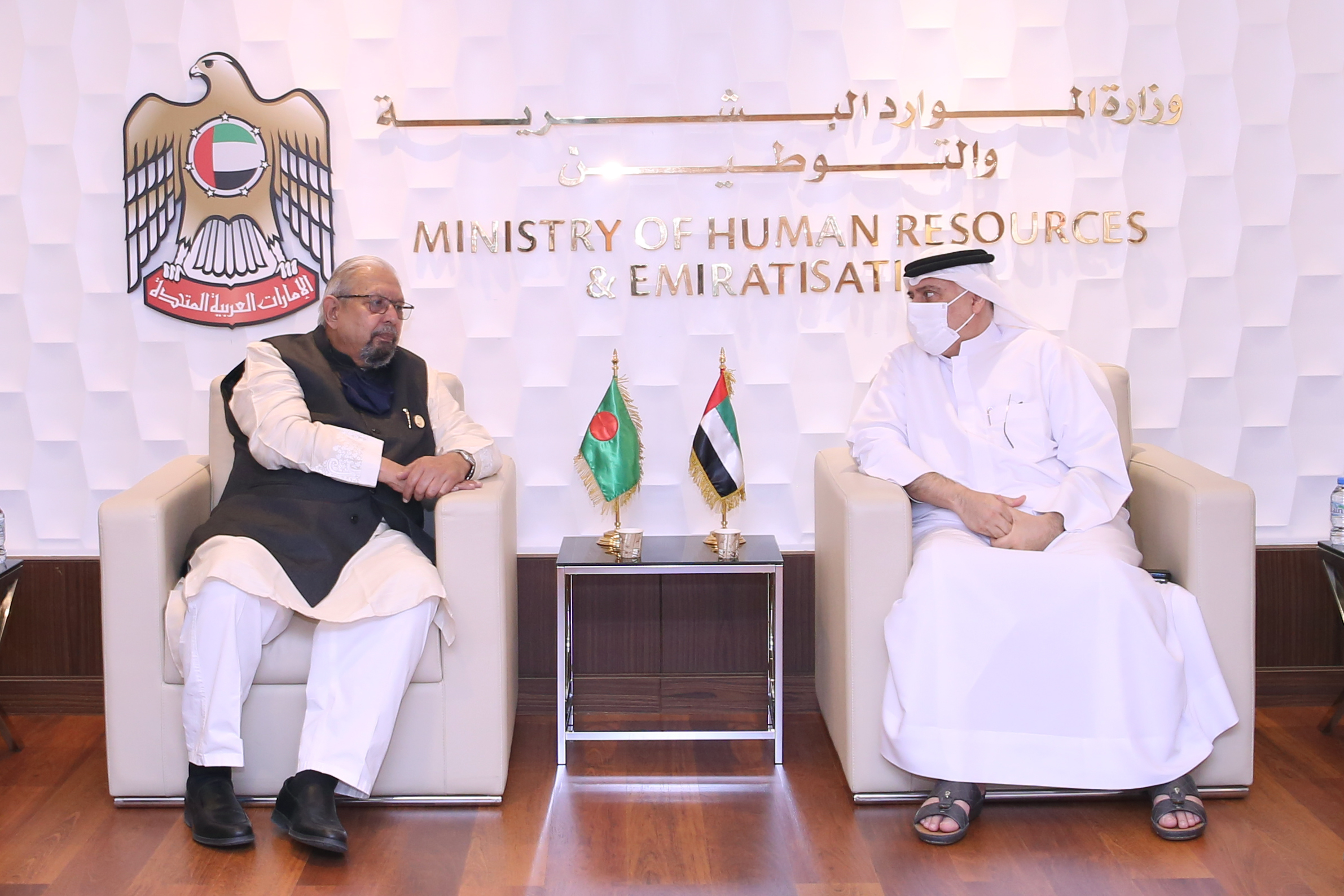 His Excellency Dr. Abdul Rahman Al Awar, Minister of Human Resources and Emiratization, discussed with His Excellency Imran Ahmad MP, Minister of Expatriates' Welfare and Overseas Employment of Bangladesh, ways to enhance cooperation between the two friendly countries in the field of manpower.