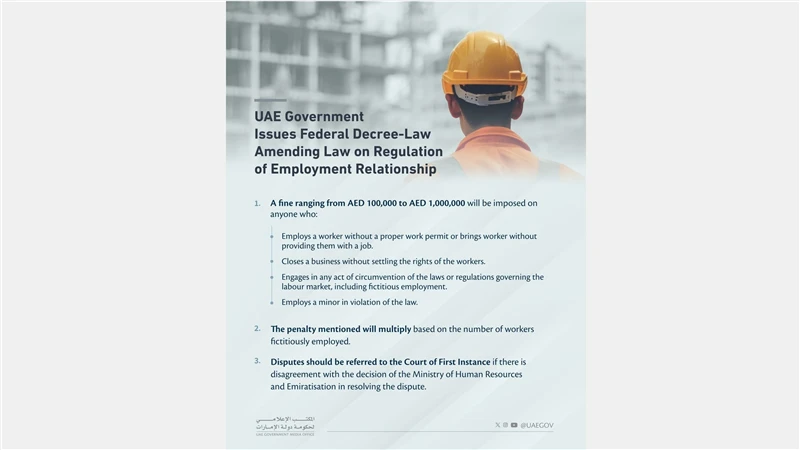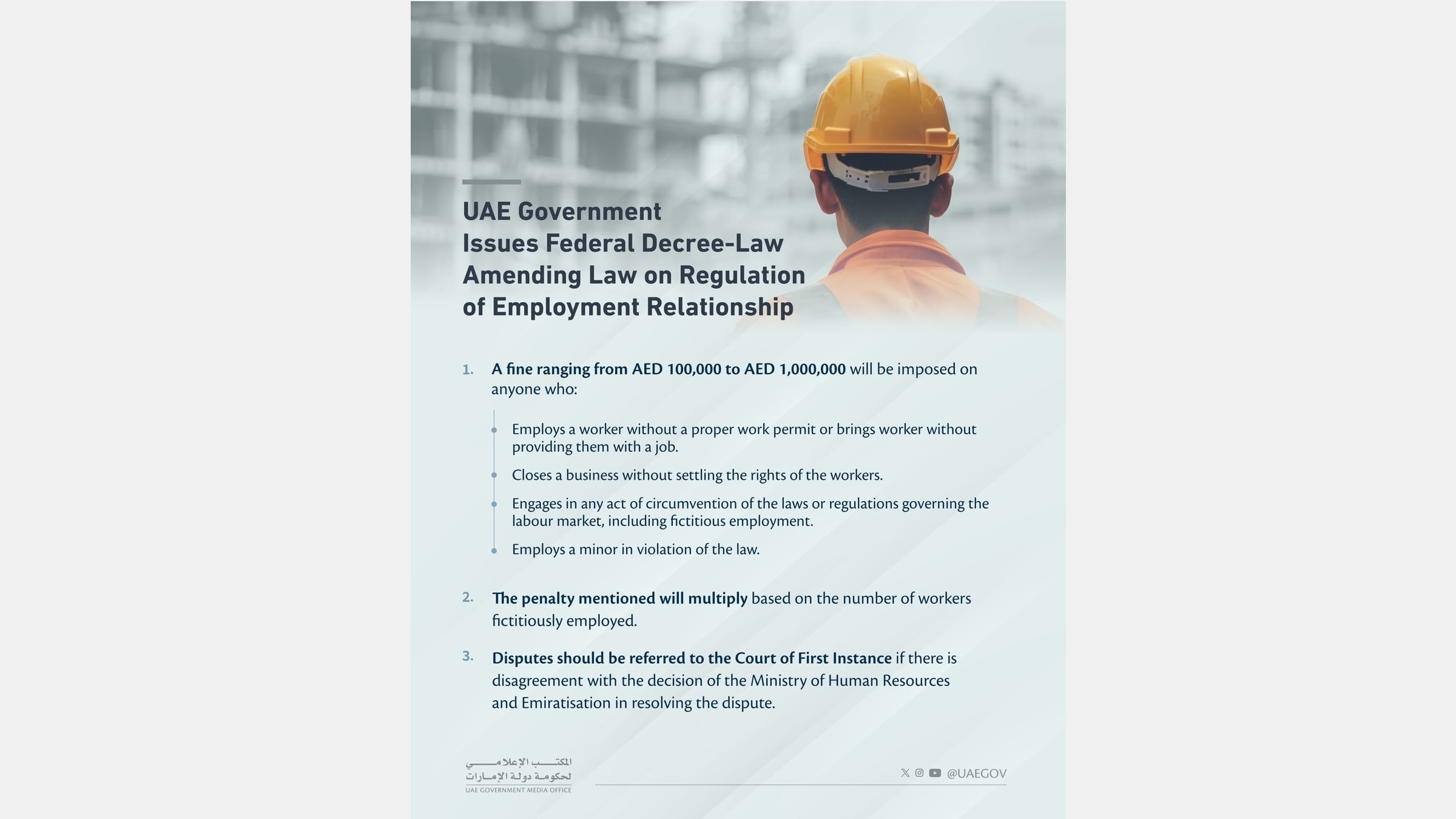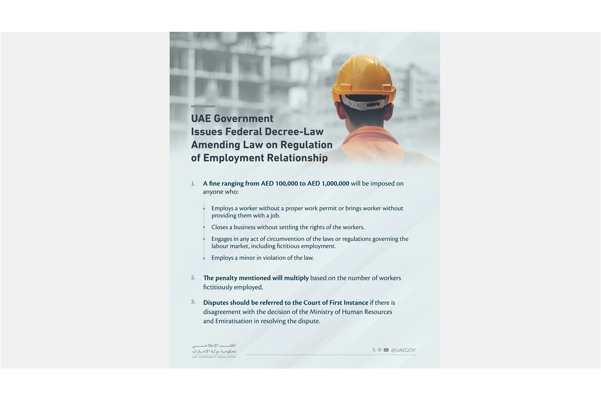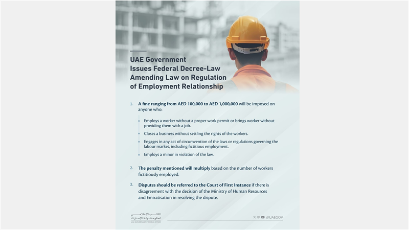 The decree imposes fines of no less than AED100,000 and no more than AED1 million on any employer who employs workers without a proper permit, hires workers or brings them to the country and fails to provide them with a job, misuses work permits, or shuts down a business or suspends its activities without settling workers' rights, in violation of the new decree and its Executive Regulations. The same penalties apply to the illegal employment of minors or allowing minors to work in violation of the law by their guardians.
