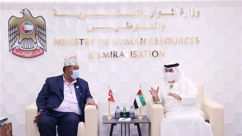 The meeting was also attended by Iknarra Ayan Ariel, Undersecretary of the Ministry of Labour, Employment and Social Security of the Republic of Nepal, Krishna Prasad Dhakal. Ambassador of Nepal to the United Arab Emirates, and Abdullah Al Nuaimi, Undersecretary of the Ministry of Human Resources and Emiratisation, Assistant for Communications and International Relations.