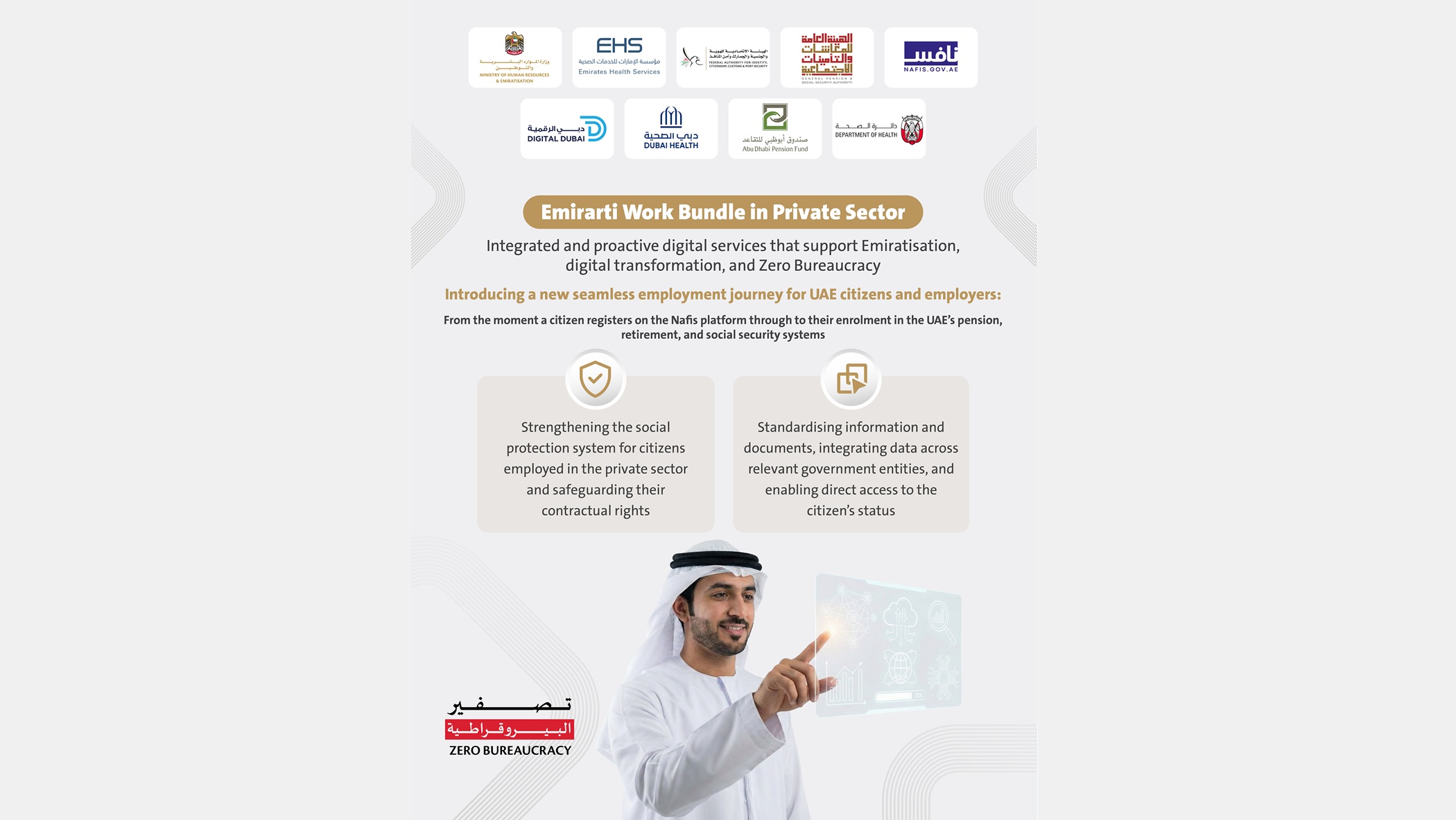 - Launched in collaboration with partners, the Emirati Work Bundle in the Private Sector offers comprehensive services from registration in ‘Nafis’ to enrolment in pension and social security systems.