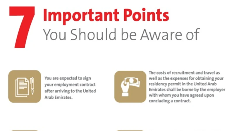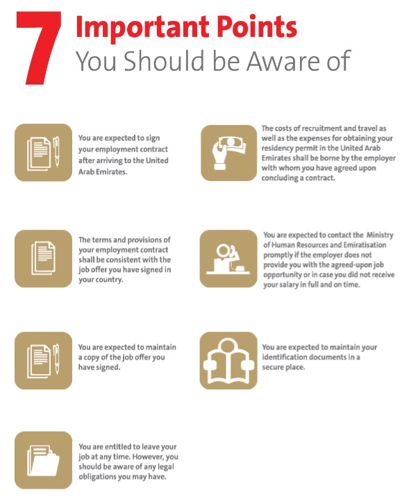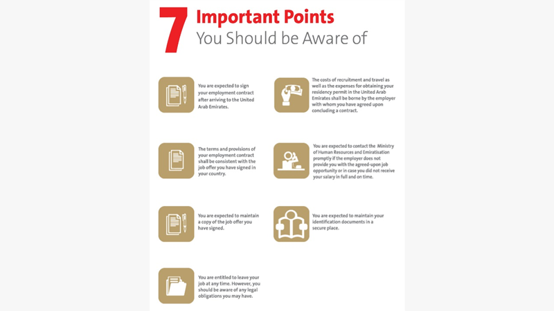 For the pre-entry stage, the guide provides a set of instructions for the worker, including a full review of the job offer, particularly with regard to the job title, responsibilities, privileges and salary level, as well as a review of the detailed annex attached to the job offer, which contains the rights and obligations set out in the labour relations law in force in the UAE.