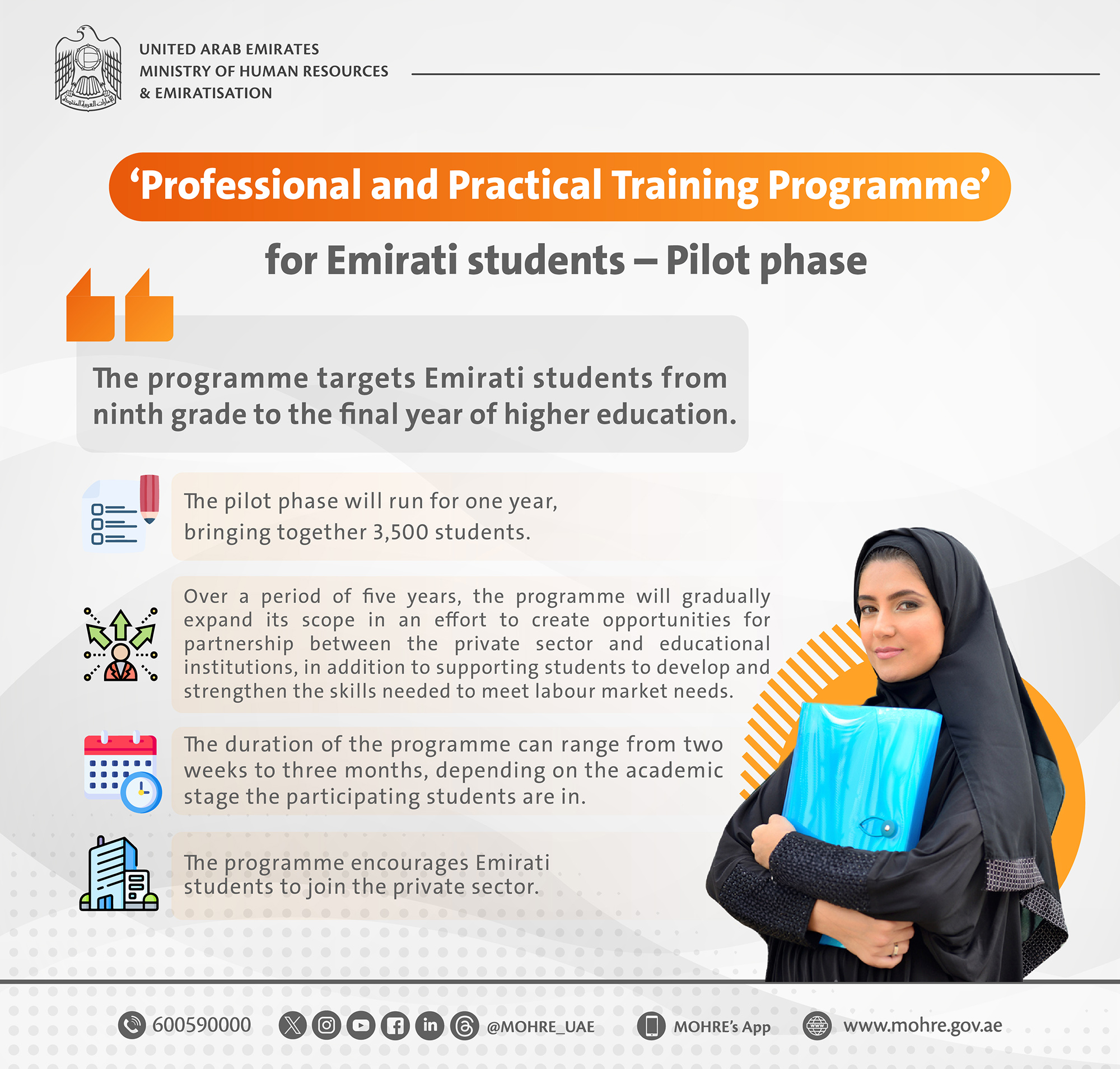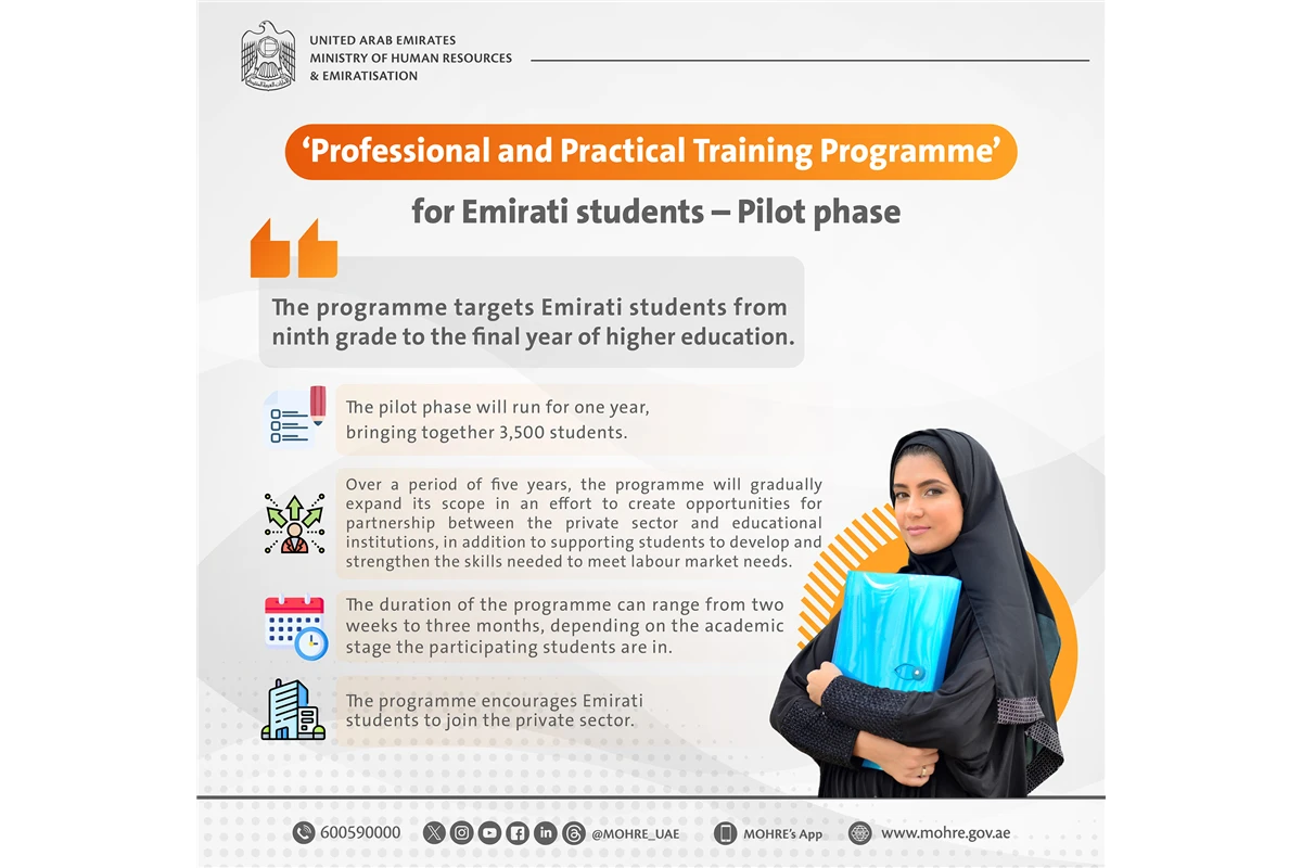 The Ministry of Human Resources and Emiratisation (MoHRE) announced the pilot launch of the ‘Professional and Practical Training Programme’ for Emirati students from the ninth grade to the final year of higher education, designed to enhance their integration into the private sector.