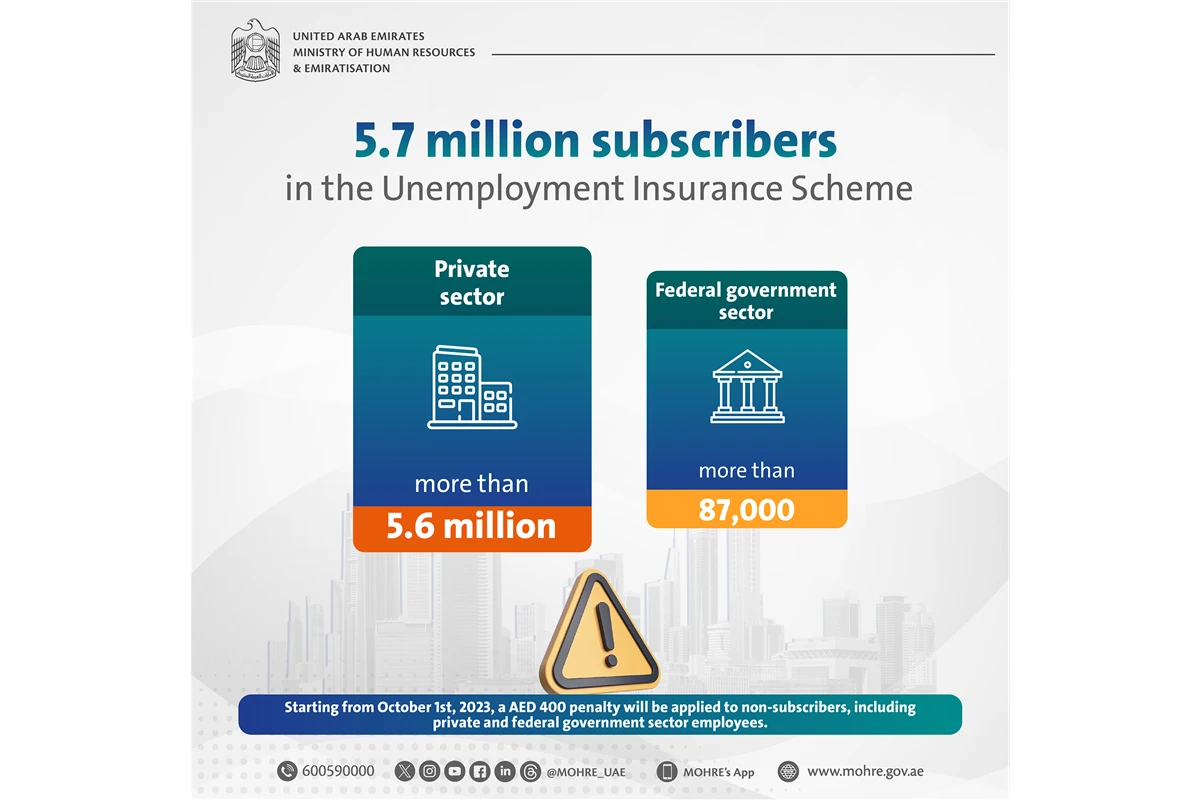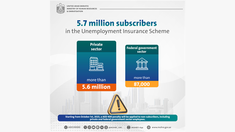 The Ministry of Human Resources and Emiratisation (MoHRE) revealed that approximately 5.73 million employees have subscribed to the Unemployment Insurance Scheme since it went into effect on 1 January 2023, up until 25 September Including more than 5.6 million subscribers in the private sector and more than 87 thousand subscribers in the federal government sector.