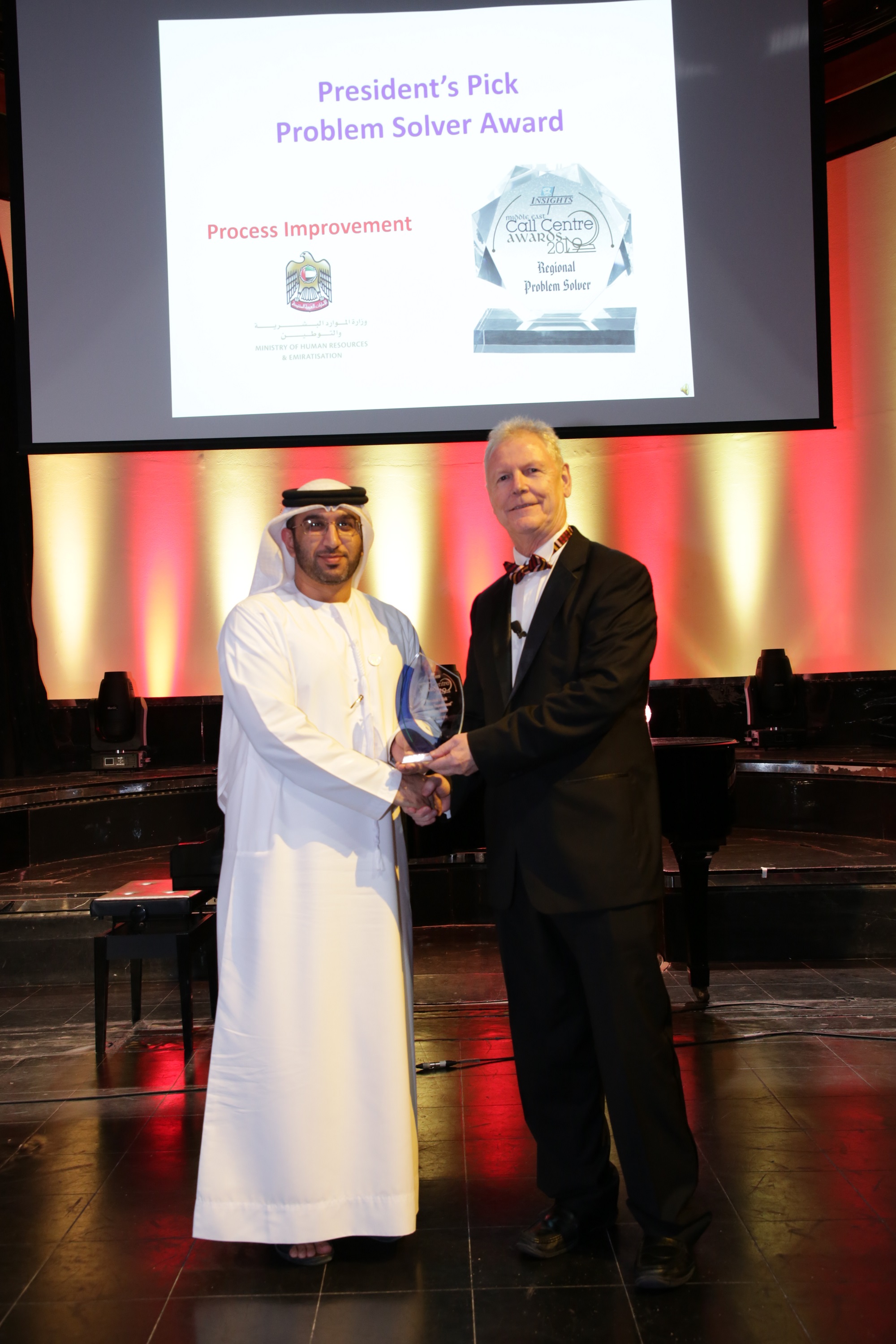 Ahmed Youssef Al Nasser, Director of Customer Relations Department at the Ministry of Human Resources and Emiratisation, received the “The Best Center in Dealing with Regional Challenges” award that is related to the rapid growth of the MOHRE’s call center in accordance with innovative creative patterns and the "President's Choices Awards” award – due to the quality of the award’s application, during the annual ceremony that was organized in Dubai lately.