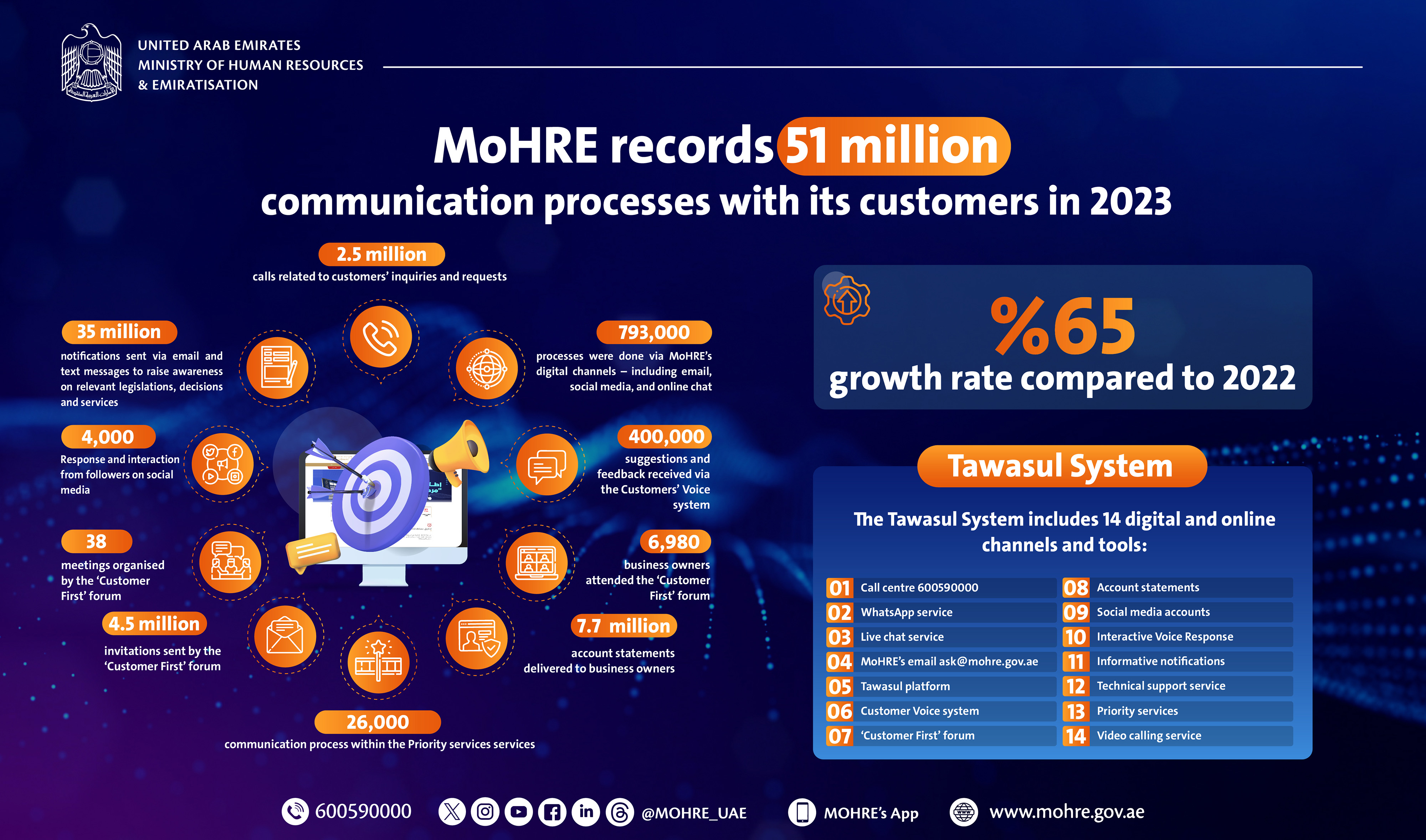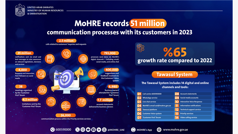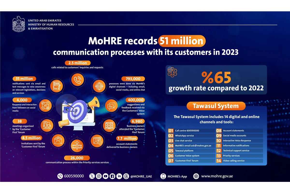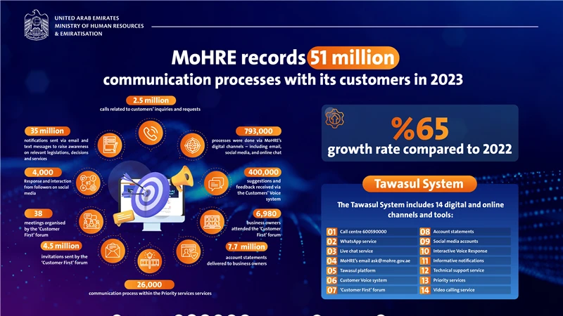 The Ministry of Human Resources and Emiratisation (MoHRE) reported over 51 million communication processes with its customers through its communication system ‘Tawasul’ in 2023, marking an increase of approximately 65% compared to 2022, where around 31 million processes were reported.