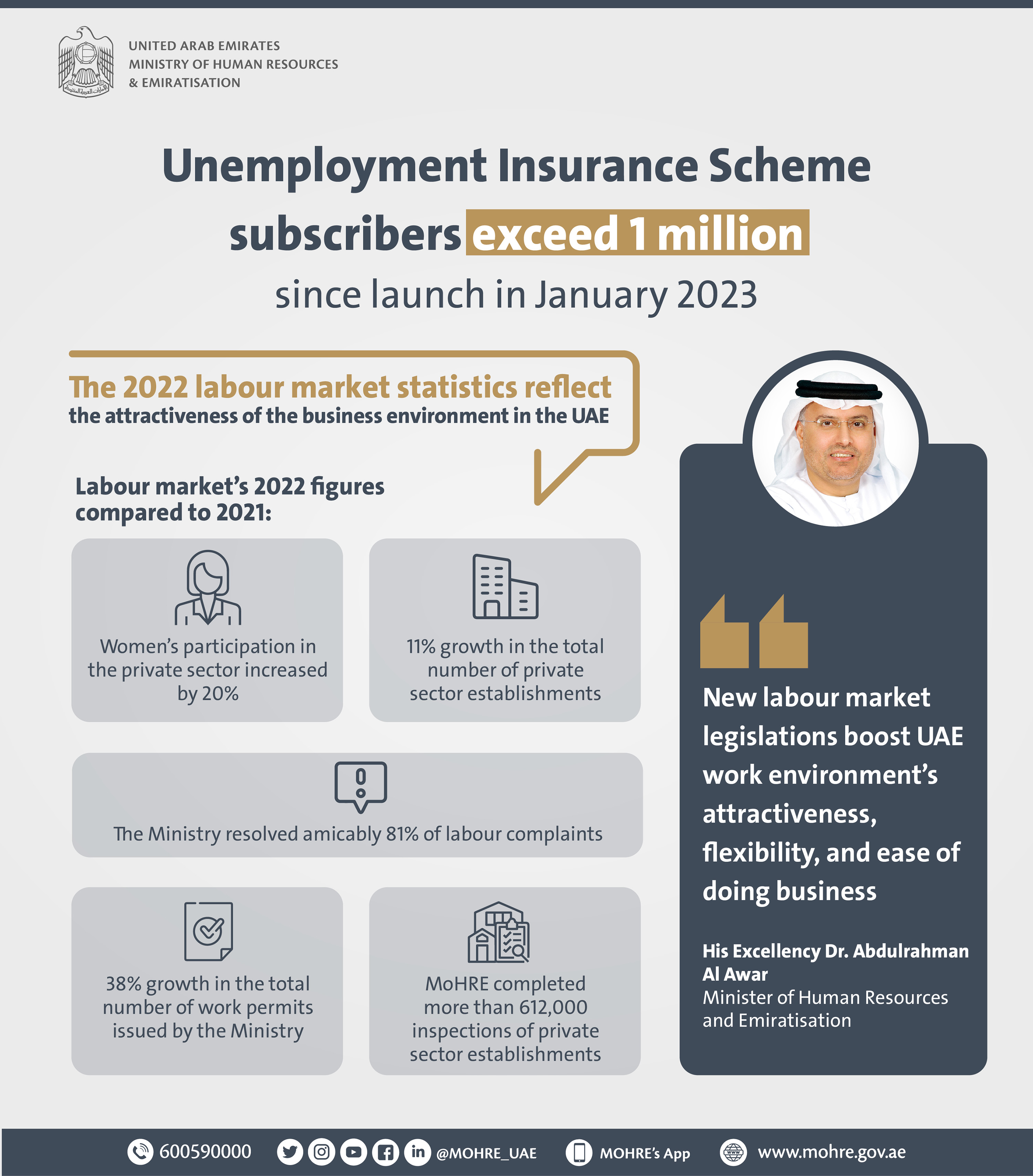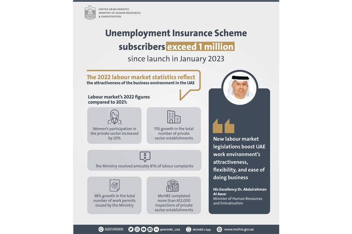 The Ministry of Human Resources and Emiratisation (MoHRE) announced that the Unemployment Insurance Scheme has exceeded one million subscribers since its launch in January 2023.