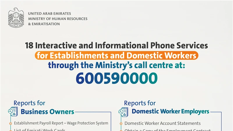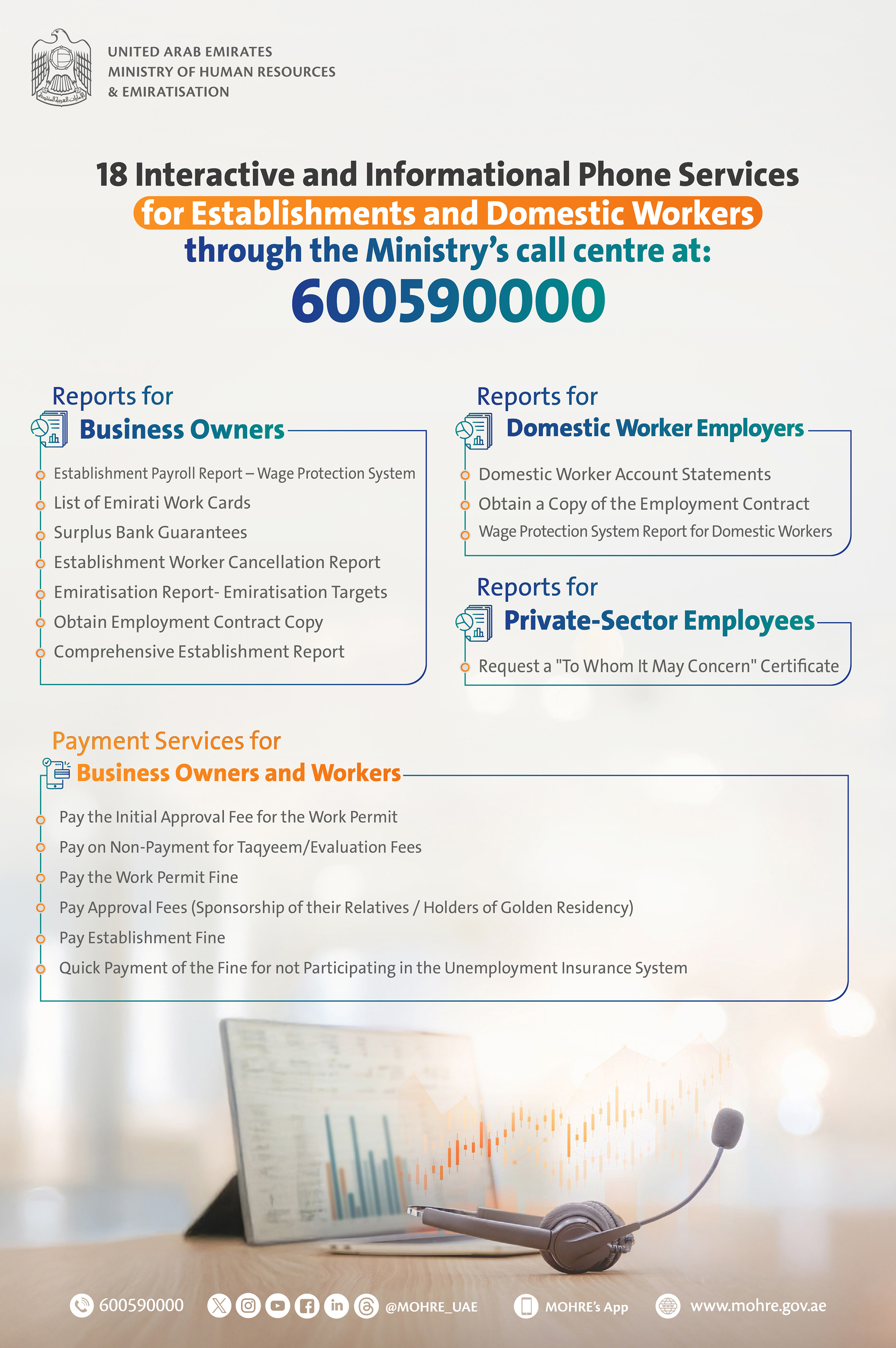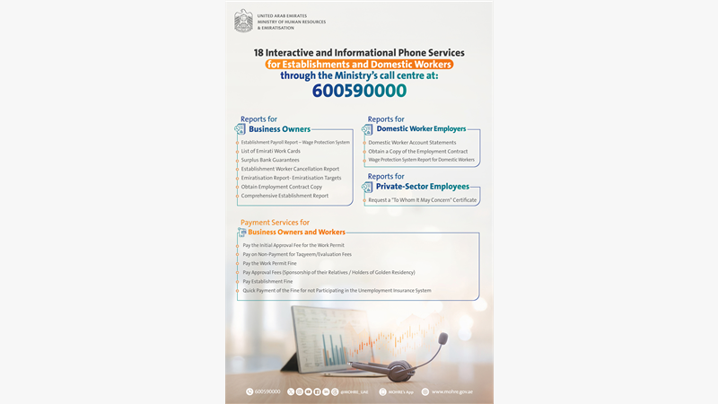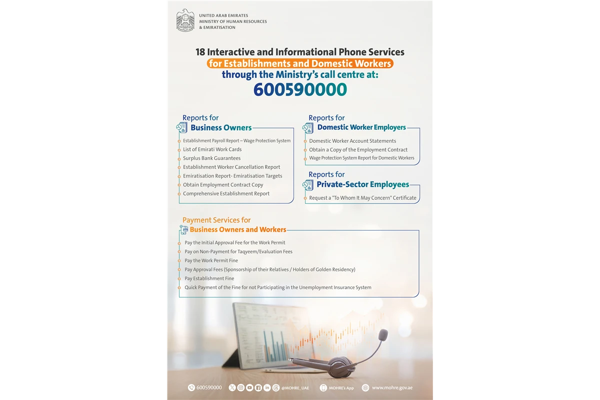 The Ministry of Human Resources and Emiratisation (MoHRE) announced 18 services for establishments and domestic workers, available through the Ministry’s call centre at 600590000.