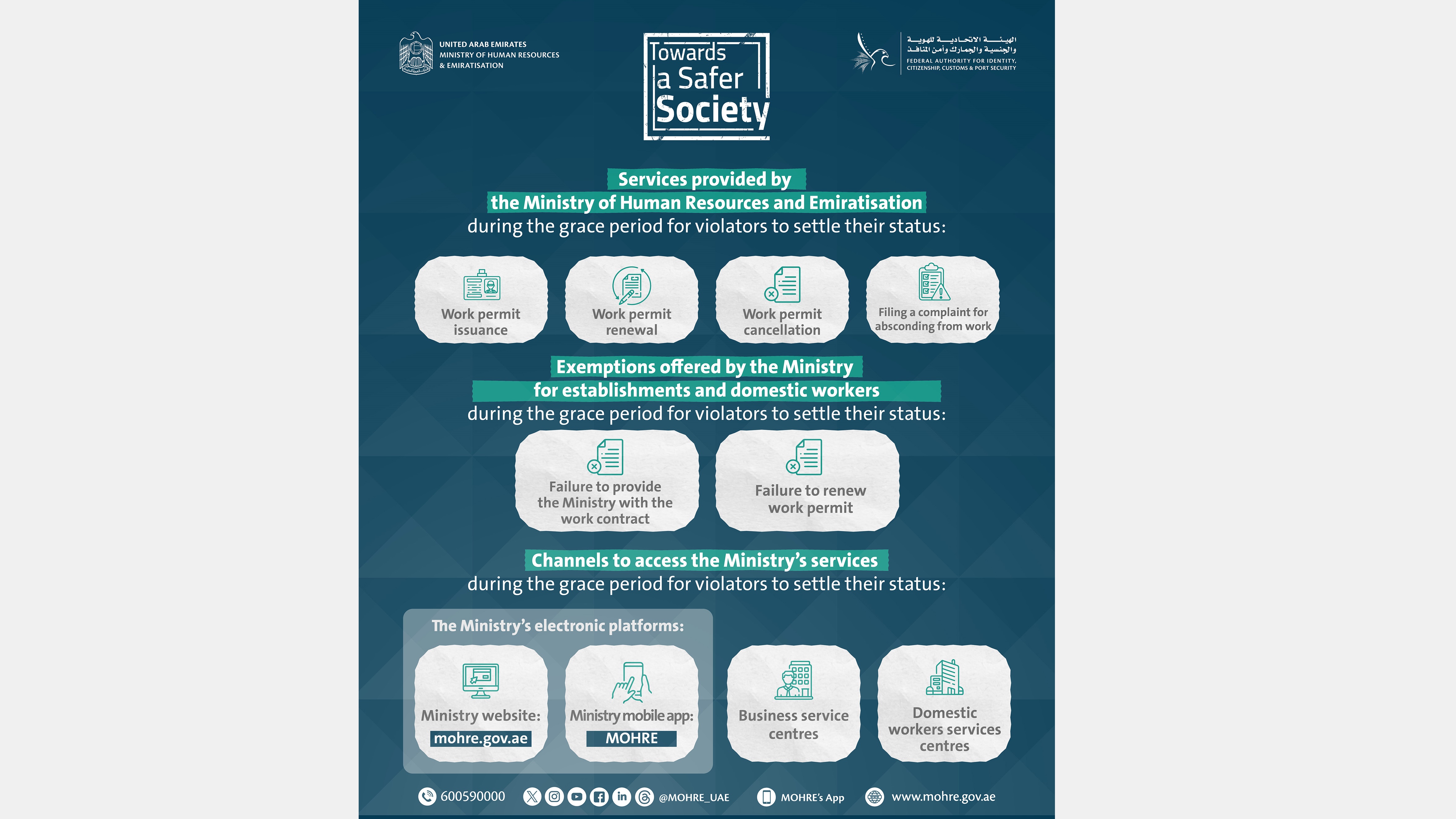 This initiative embodies the UAE’s values of tolerance, compassion, and social cohesion, providing violators an exceptional opportunity to rectify their status and to continue working and living in the UAE with their families while following and respecting the law.