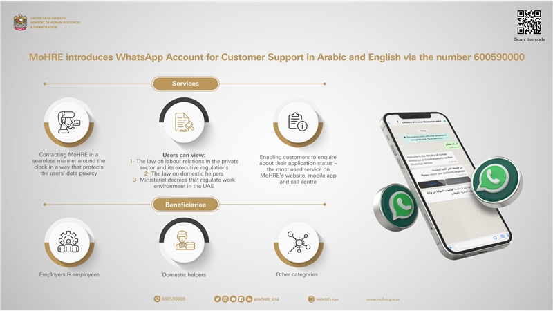 The Ministry of Human Resources and Emiratisation (MoHRE) has introduced a WhatsApp business account for customers to get in touch and submit enquiries. The services will be available in English and Arabic, and customers can reach the ministry via the number 600590000.