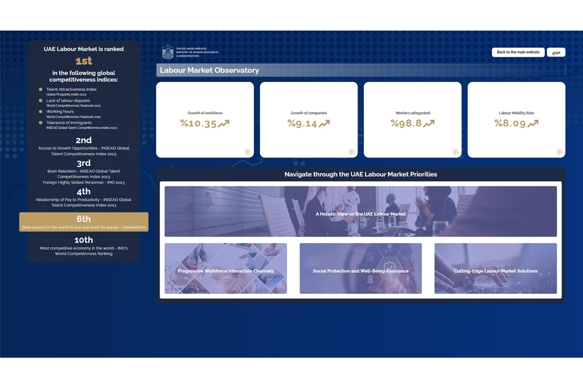 The Ministry of Human Resources and Emiratisation (MoHRE) has launched the UAE Labour Market Observatory, designed to provide periodic data and information in both Arabic and English on various competitiveness indicators of the UAE labour market, outputs of the policies set to regulate it, and information about innovative services, programmes, and initiatives, along with other subjects relevant to the labour market.