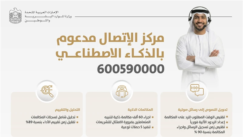 وأوضح العليلي" ان النتائج الأولية لدمج الذكاء الاصطناعي في مركز الاتصال أثبت فاعلية كبيرة في تطوير عمل المركز وهو ما يعكس جاهزية الوزارة، وكفاءة الكوادر البشرية، وقدرتها على الاستفادة من التكنولوجيا الجديدة في مختلف المجالات، وتطوير خدمات تواكب احتياجات المتعاملين، بما يعزز دورها في ريادة الخدمات الحكومية، وتصفير البيروقراطية الحكومية، وهو ما ينعكس على تحقيق الأهداف الحكومية في التحول الرقمي، ويدعم مكانة الإمارات بوصفها المكان المثالي للعيش والعمل والاستثمار .