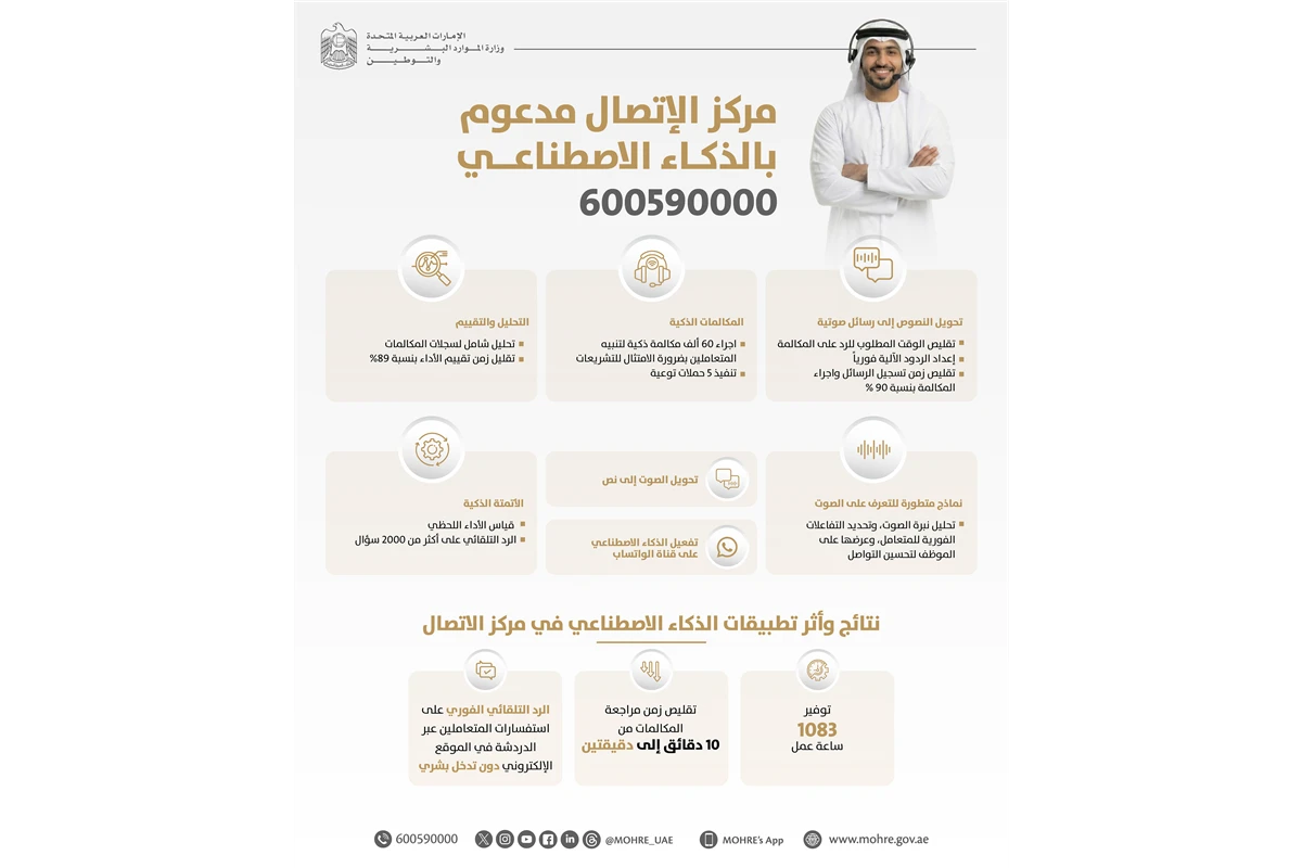 أعلنت وزارة الموارد البشرية والتوطين عن دمج الذكاء الاصطناعي في مركز الاتصال التابع للوزارة بما يدعم تعزيز جودة الخدمات وكفاءة العمليات وذلك من خلال تبني تقنيات الذكاء الاصطناعي الحديثة، التي تسهم في تحسين تجربة المتعامل وتسريع الاستجابة، ورفع مستوى الأداء، وذلك ضمن الابتكار في تقديم الخدمات الحكومية.