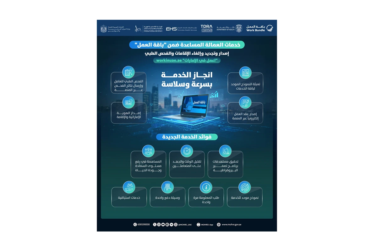 وتتيح الخدمة الجديدة إنجاز خدمات إصدار، وتجديد، وإلغاء إقامات العمالة المساعدة في الدولة، وخدمات الفحص الطبي وذلك عبر المنصة الرقمية الموحدة لـ"باقة العمل "، وهي "اعمل في الإمارات" workinuae.ae.