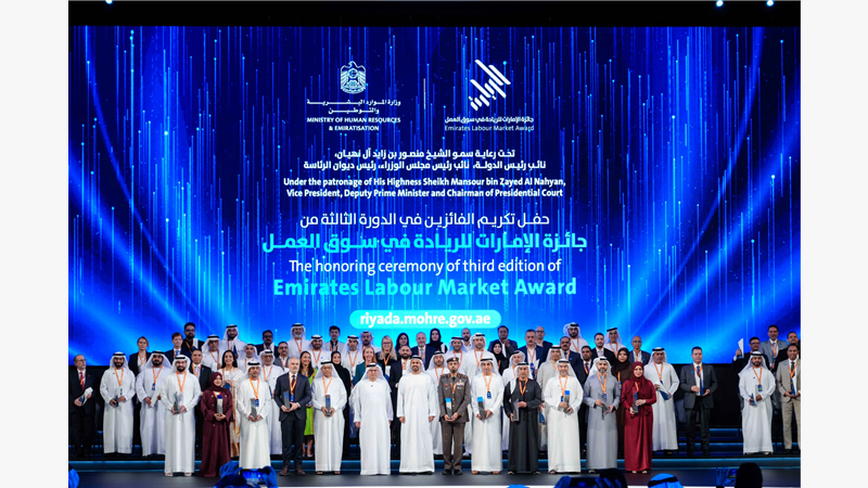 أبوظبي في 13 نوفمبر/ وام / تحت رعاية سموّ الشيخ منصور بن زايد آل نهيان، نائب رئيس الدولة نائب رئيس مجلس الوزراء رئيس ديوان الرئاسة، كرّم سموّ الشيخ ذياب بن محمد بن زايد آل نهيان، نائب رئيس ديوان الرئاسة للشؤون التنموية وأسر الشهداء، ومعالي الدكتور عبدالرحمن العور، وزير الموارد البشرية والتوطين وزير التعليم العالي والبحث العلمي بالإنابة رئيس اللجنة الإشرافية لجائزة الإمارات للريادة في سوق العمل، الفائزين في الدورة الثالثة من الجائزة الأولى من نوعها في الدولة لتكريم الممارسات الرائدة والمتميزة في سوق العمل على مستوى شركات القطاع الخاص والقوى العاملة، خلال حفل نظَّمته الوزارة في مركز أدنيك أبوظبي.