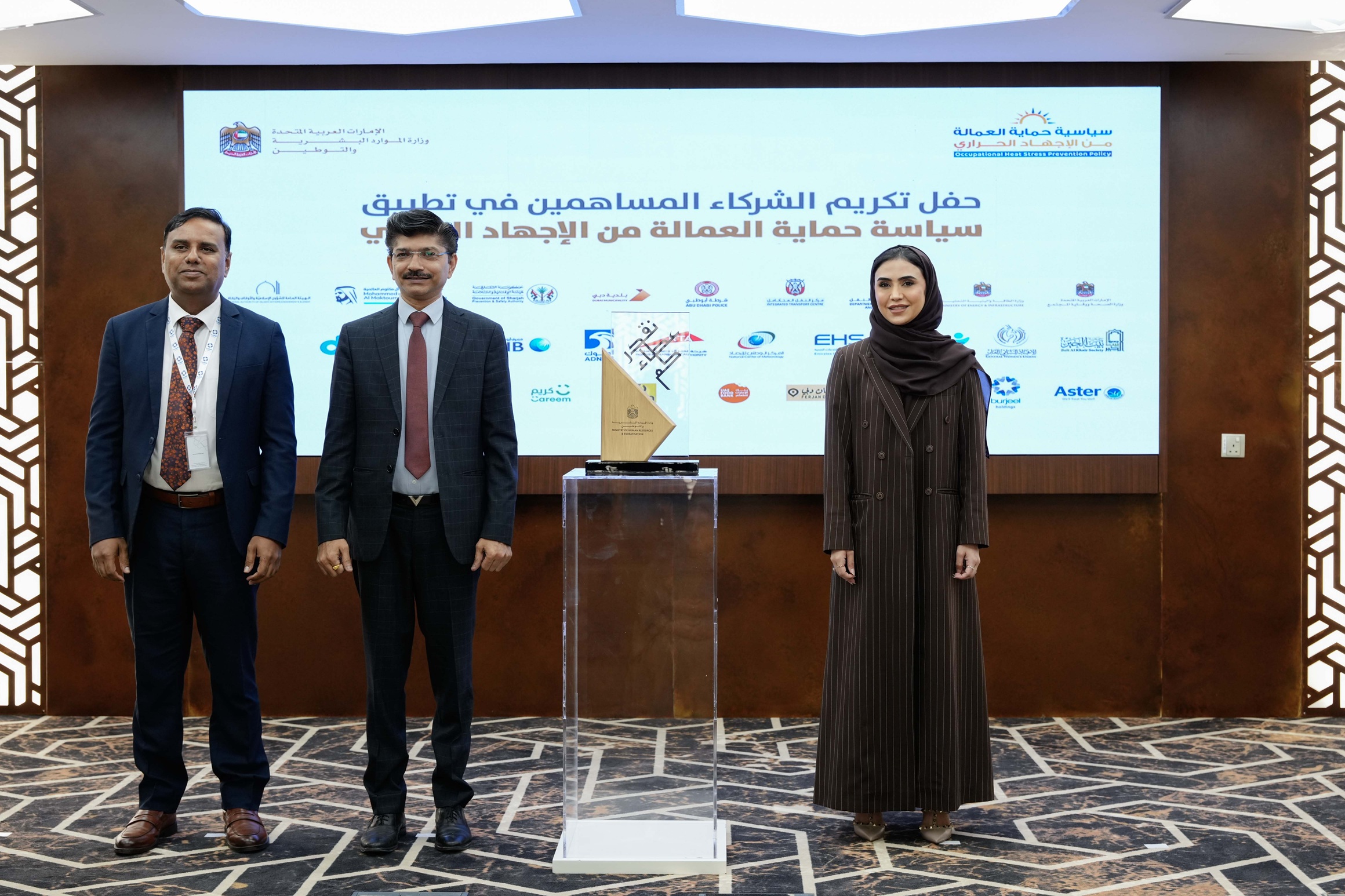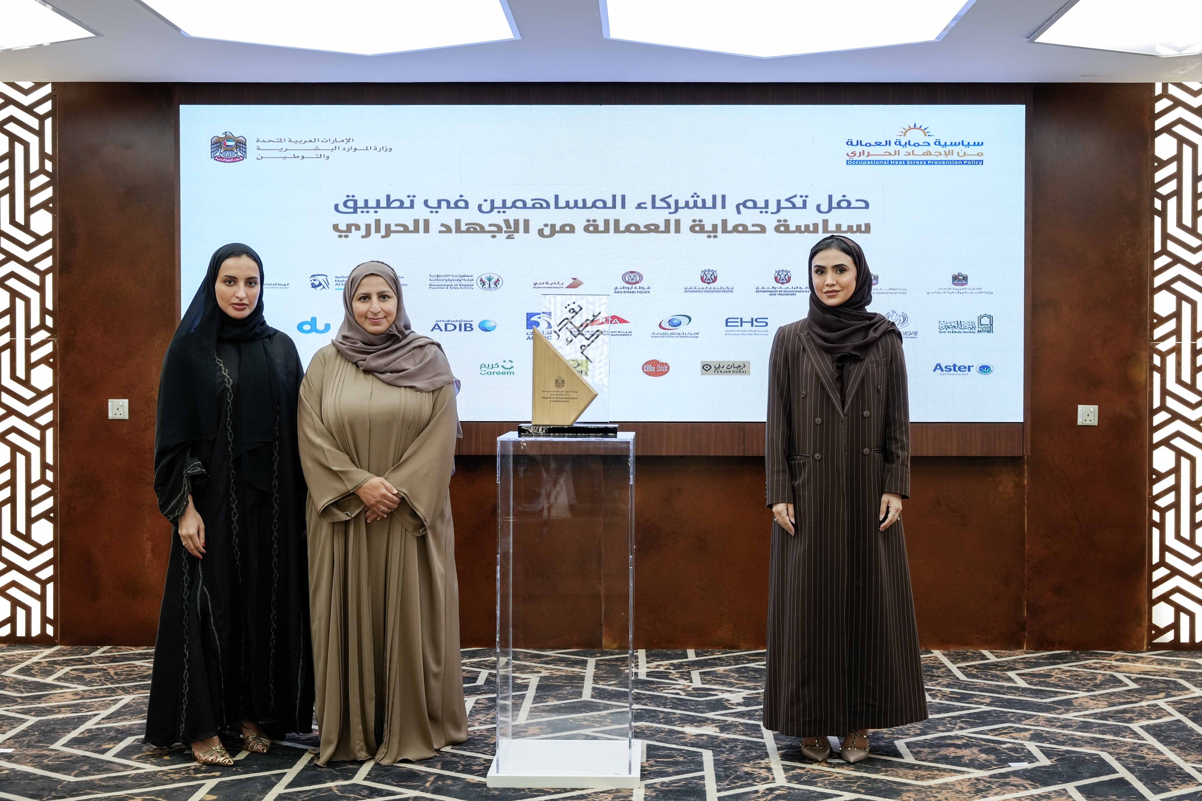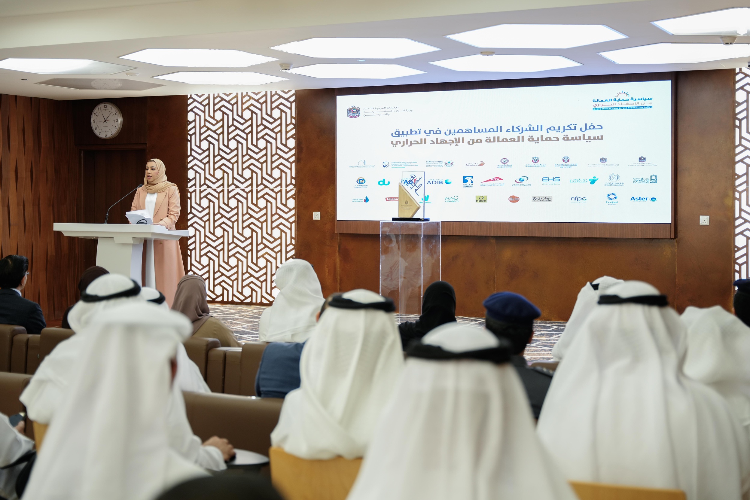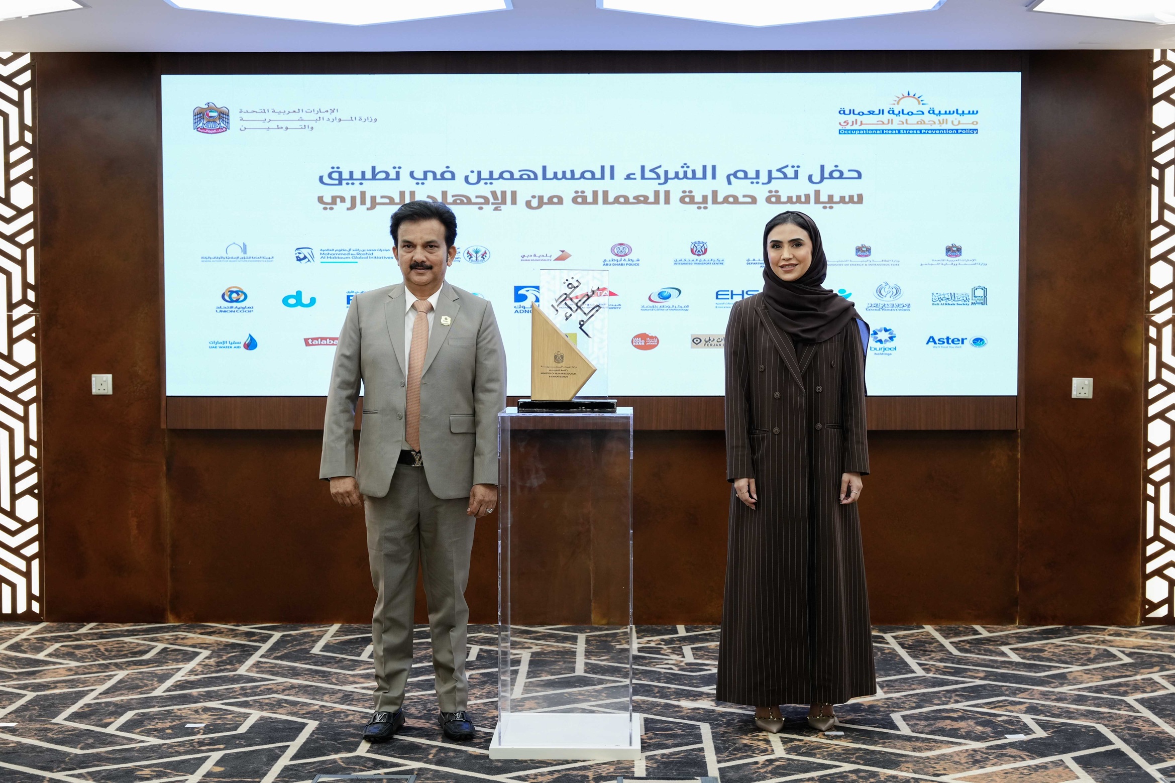كرمت وزارة الموارد البشرية والتوطين في حفل نظمته في مبناها بدبي، 21 جهة من شركائها في الجهات الحكومية الاتحادية والمحلية والقطاع الخاص لمساهمتهم بفاعلية في حملة سياسة "حماية العمالة من الاجهاد الحراري" لهذا العام والتي اختتمت في 15 سبتمبر الجاري، بنسبة التزام بلغت 99% من الشركات.